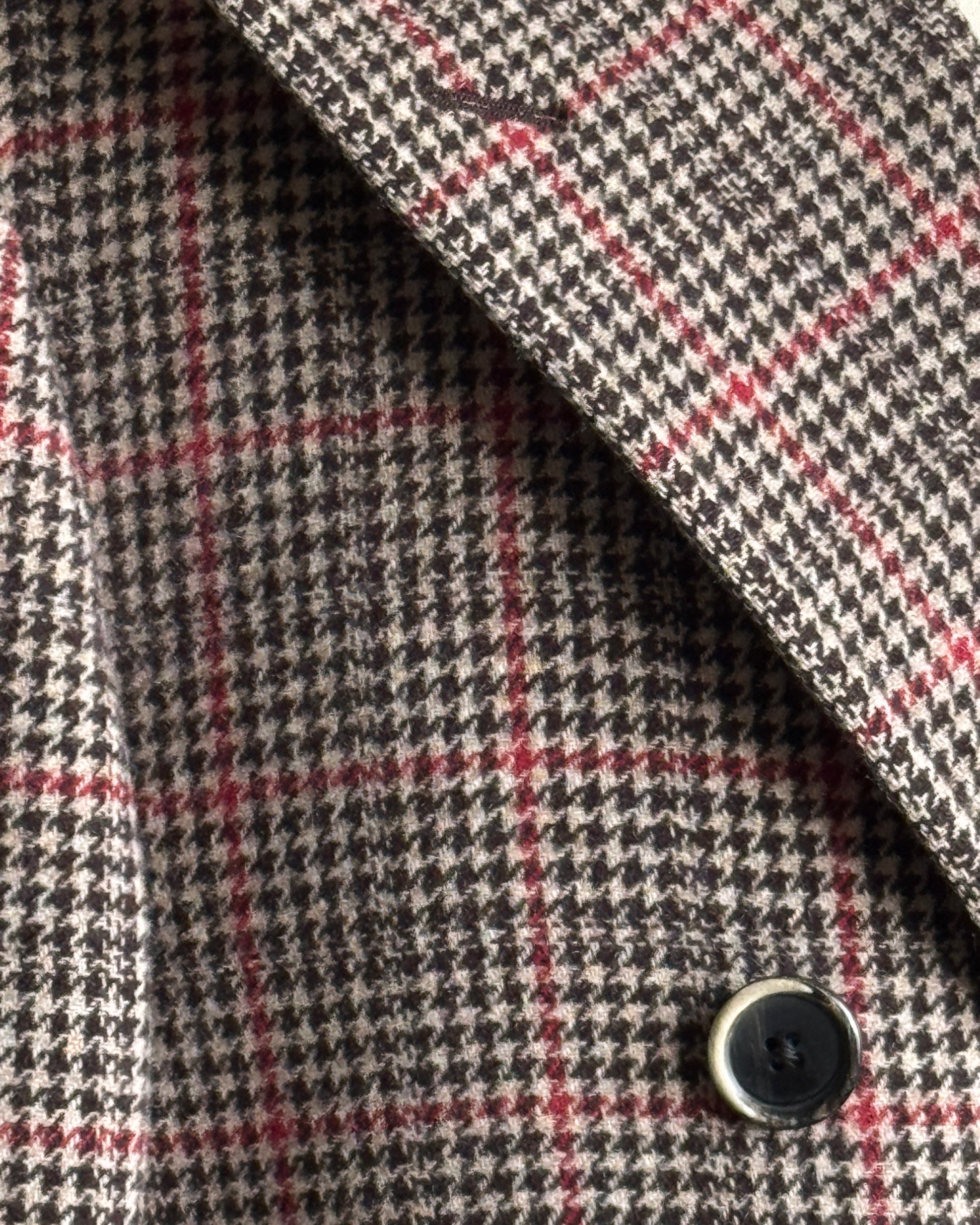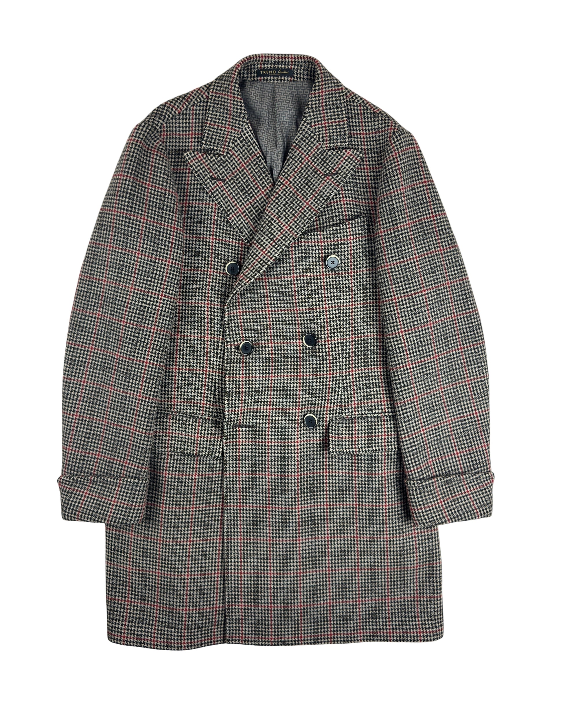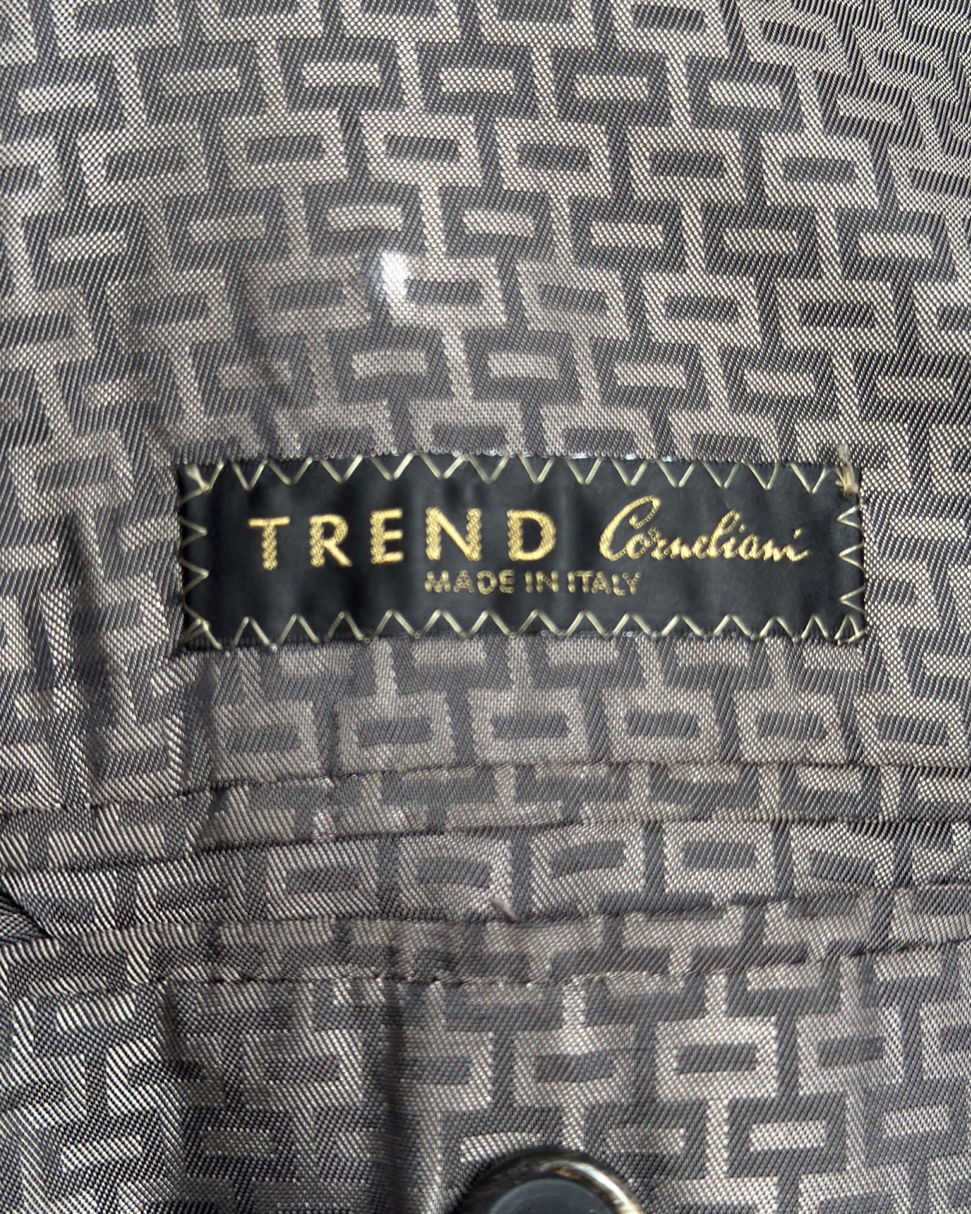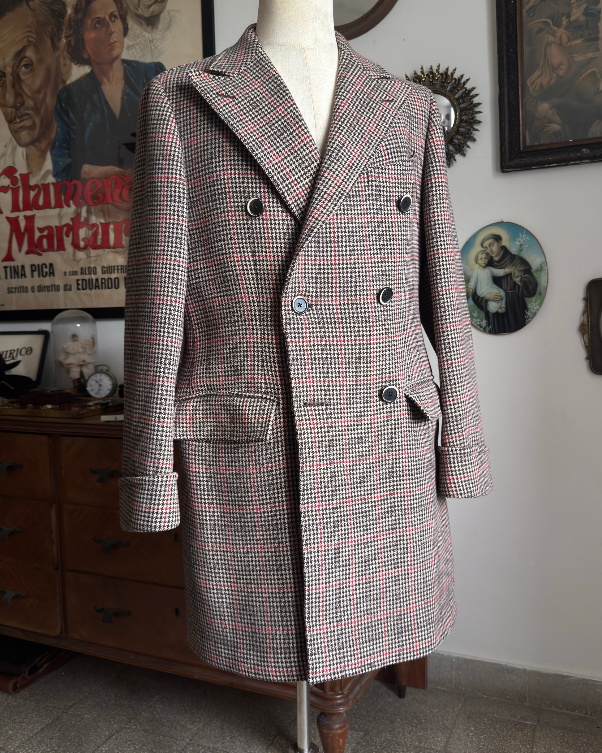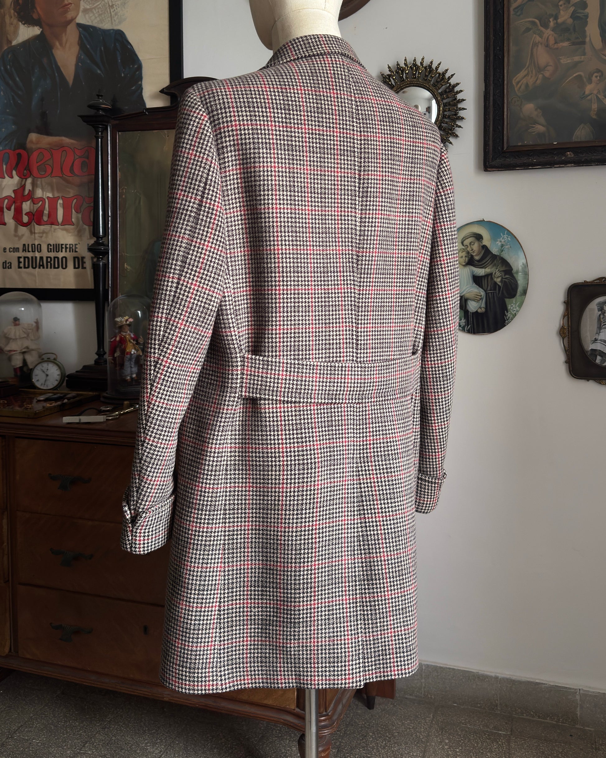 Elegante cappotto vintage 'Trend Corneliani' in misto lana e cashmere, realizzato con la tecnica del doppio petto. La trama presenta un raffinato motivo a quadri su fondo beige con dettagli in pied de poul e quadro rosso che conferiscono carattere al capo. Caratterizzato dalla martingala posteriore e dai risvolti sui polsini tipici del taglio polo coat, questo pezzo rappresenta un'eccellente interpretazione dello stile classico sartoriale. Una scelta sofisticata per chi apprezza i dettagli costruttivi e la qualità dei materiali nobili.