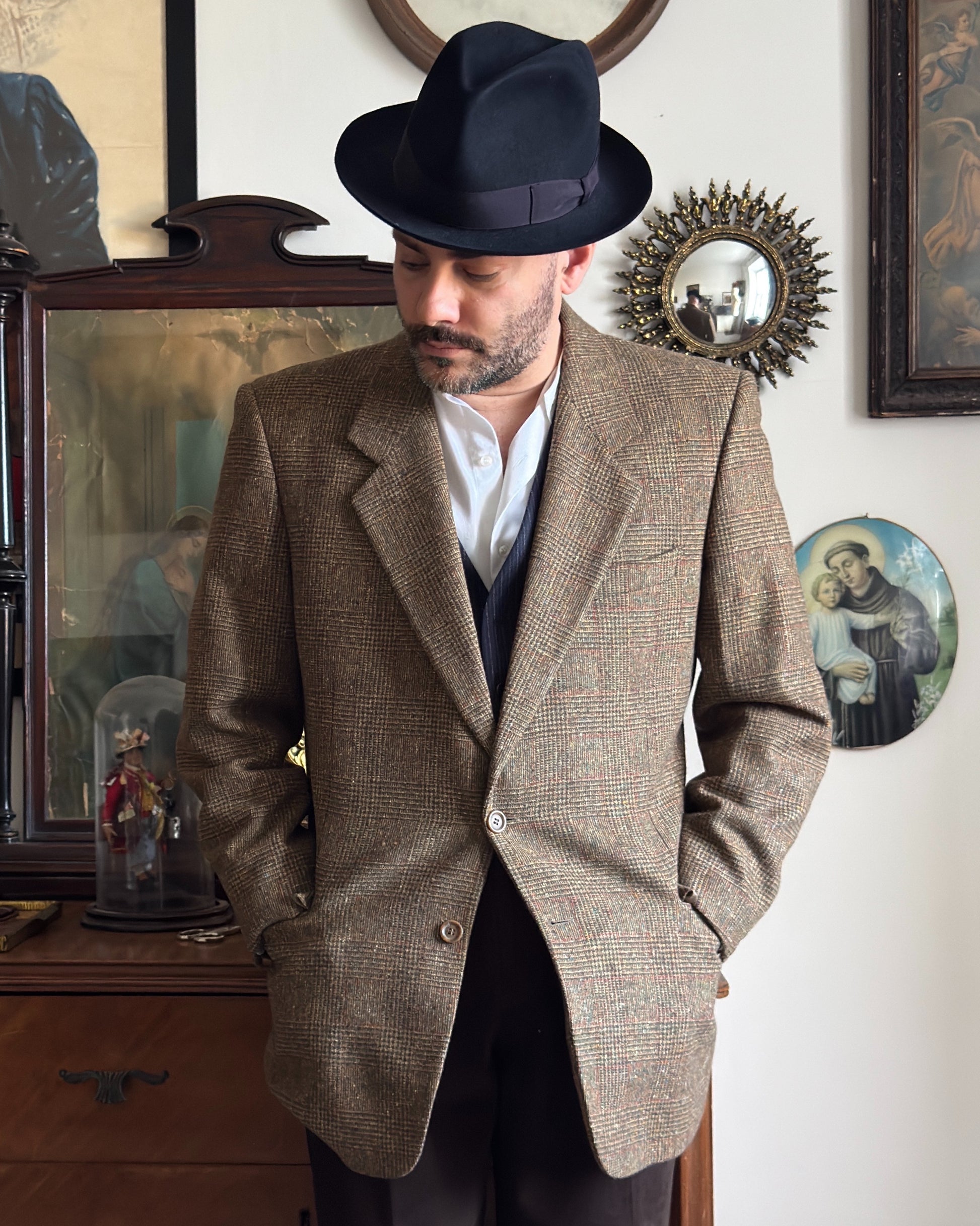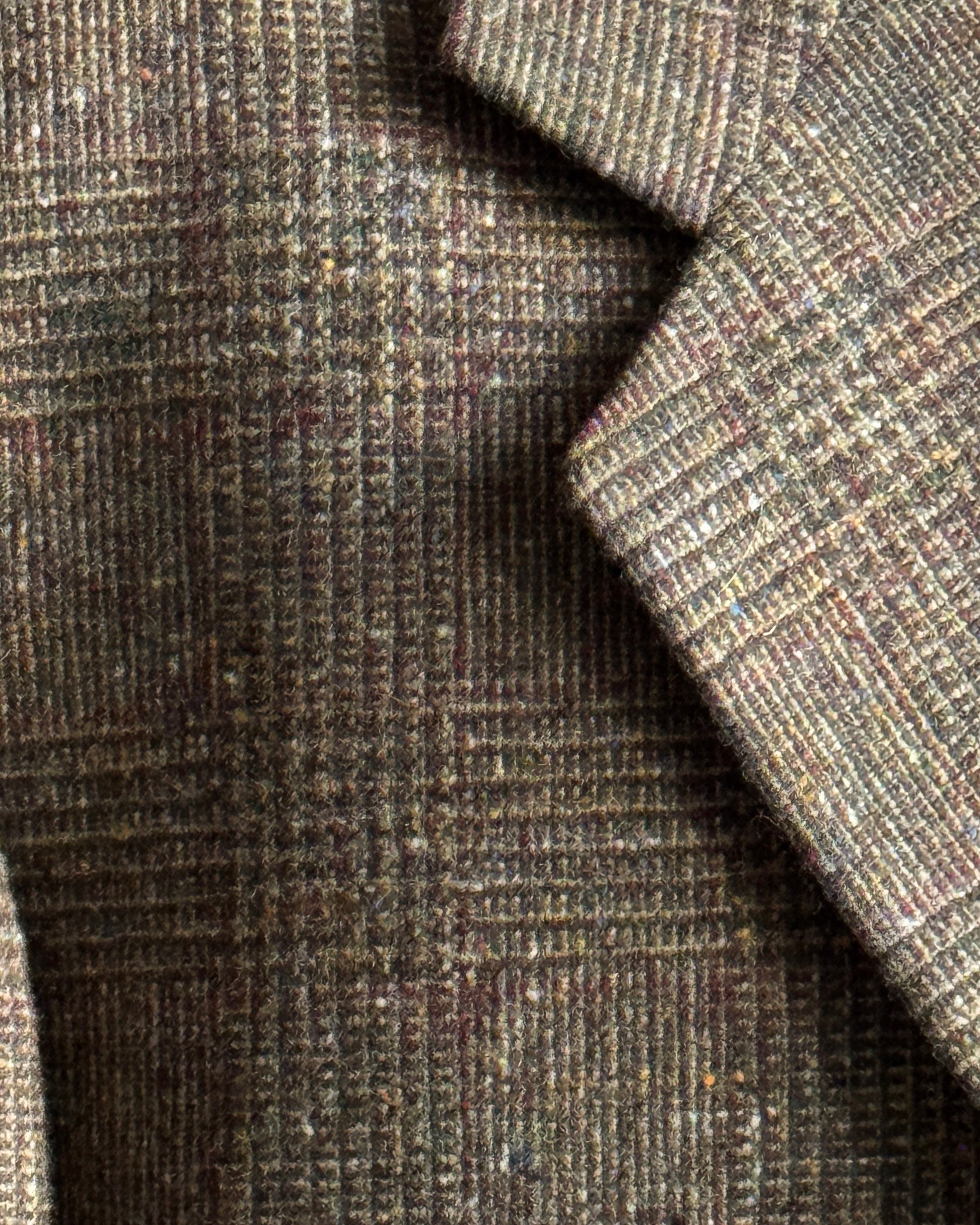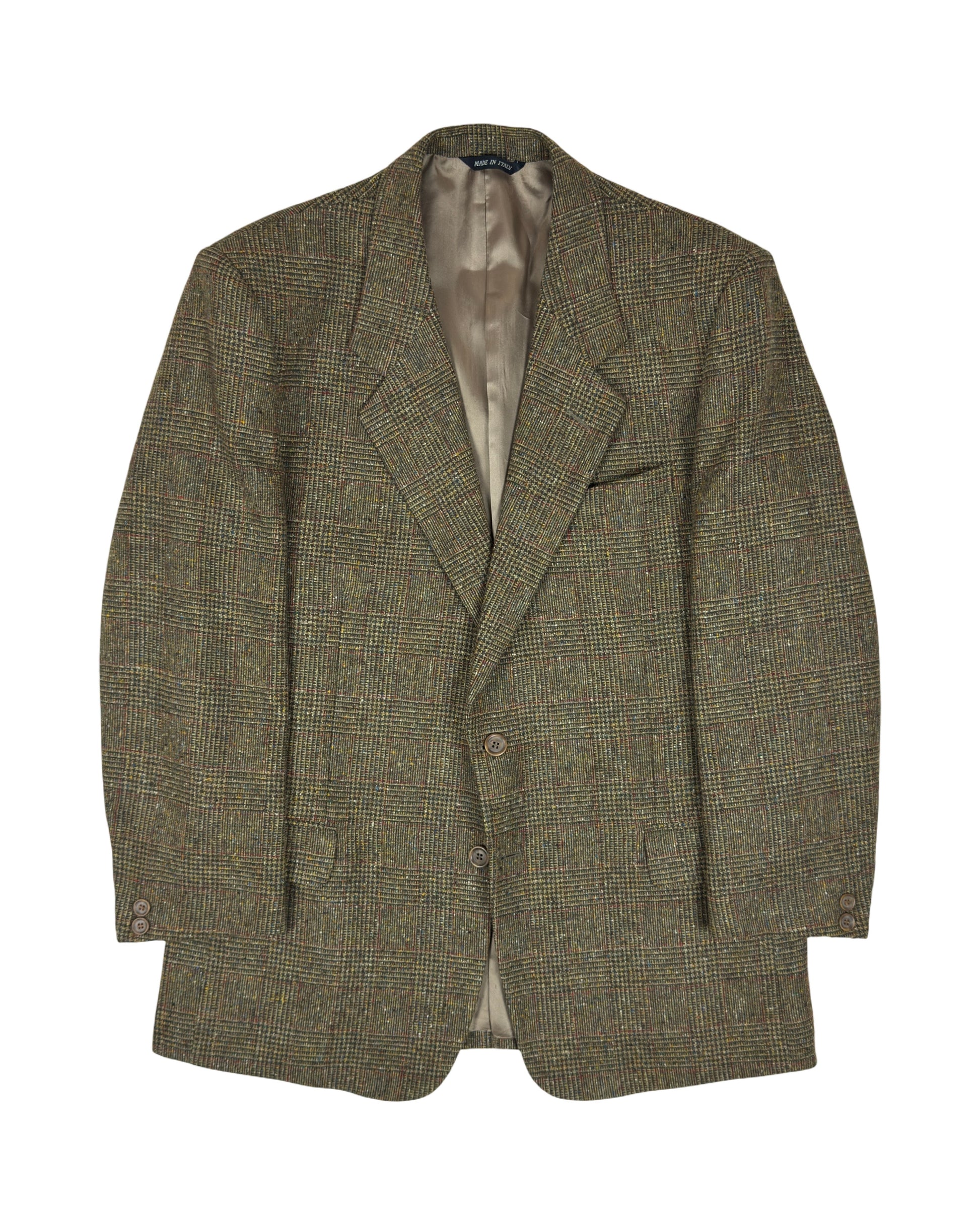 Elegante giacca vintage in pura lana tweed, caratterizzata da una trama ricca e irregolare che rispecchia l'autenticità dei tessuti inglesi tradizionali. Il pattern check combina tonalità naturali di verde oliva, marrone e beige, creando un effetto visivo sofisticato e versatile. Chiusura a due bottoni, perfetta per layering o indossata singolarmente. Un pezzo senza tempo che incarna lo stile classico britannico, ideale per chi apprezza la qualità costruttiva e l'estetica vintage autentica.