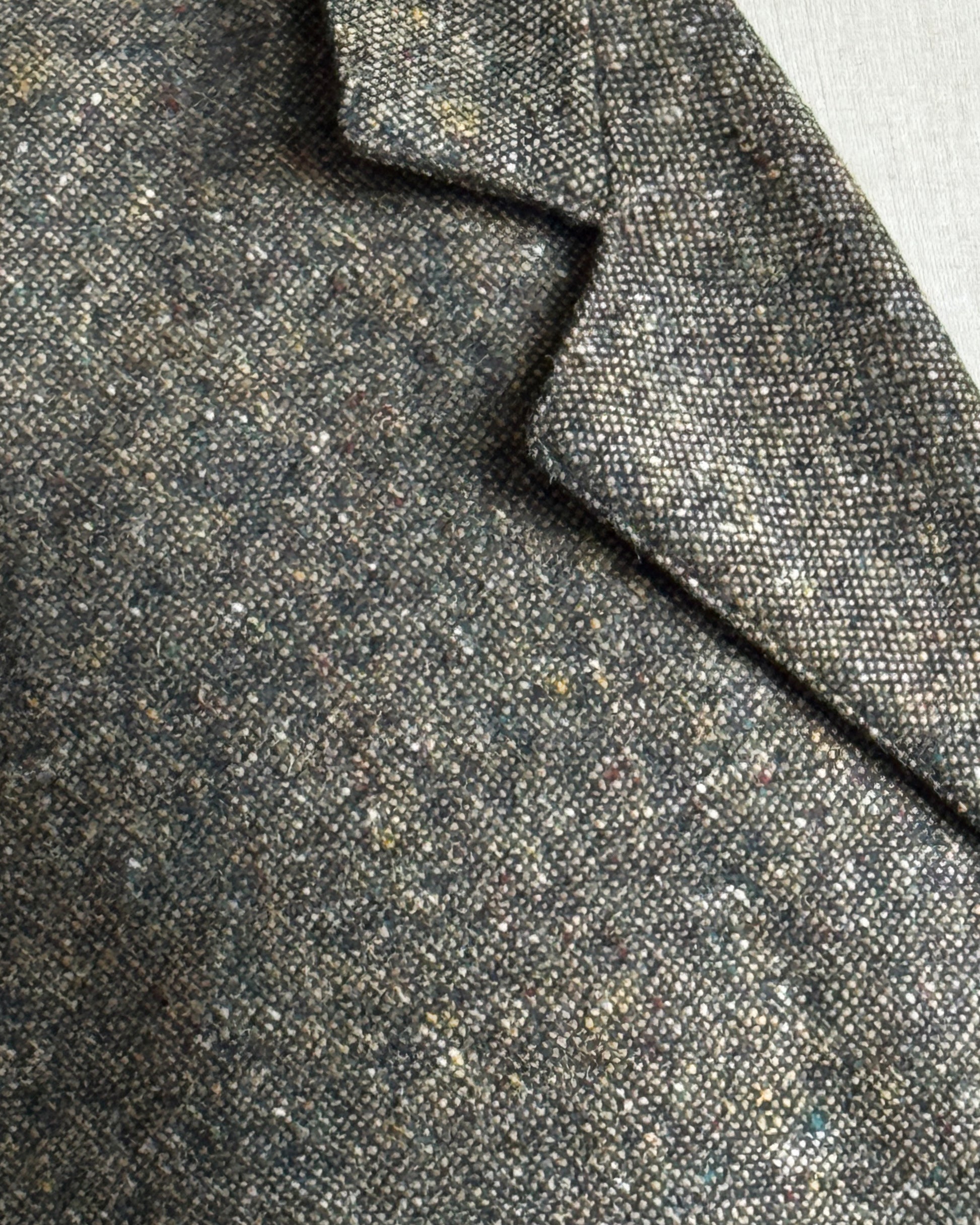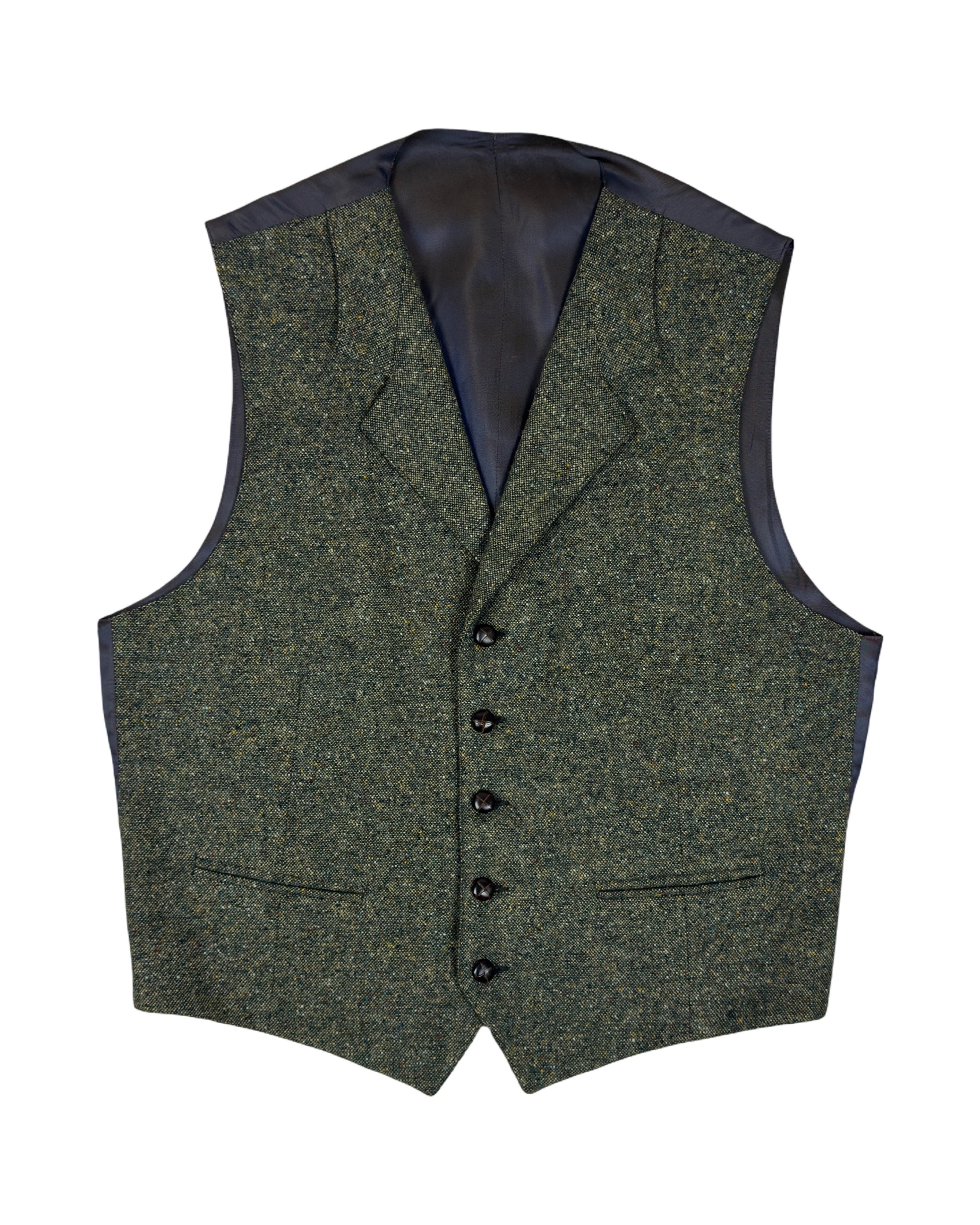 Elegante panciotto vintage in pura lana, caratterizzato da una raffinata tonalità verde oliva arricchita da una delicata puntinatura multicolore che conferisce profondità e movimento al tessuto. Il modello presenta un'elegante scollatura con revers, dettaglio classico che esalta la silhouette. Perfetto per chi ricerca autenticità e stile senza tempo, questo capo rappresenta un'eccellente scelta per composizioni versatili e sofisticate.