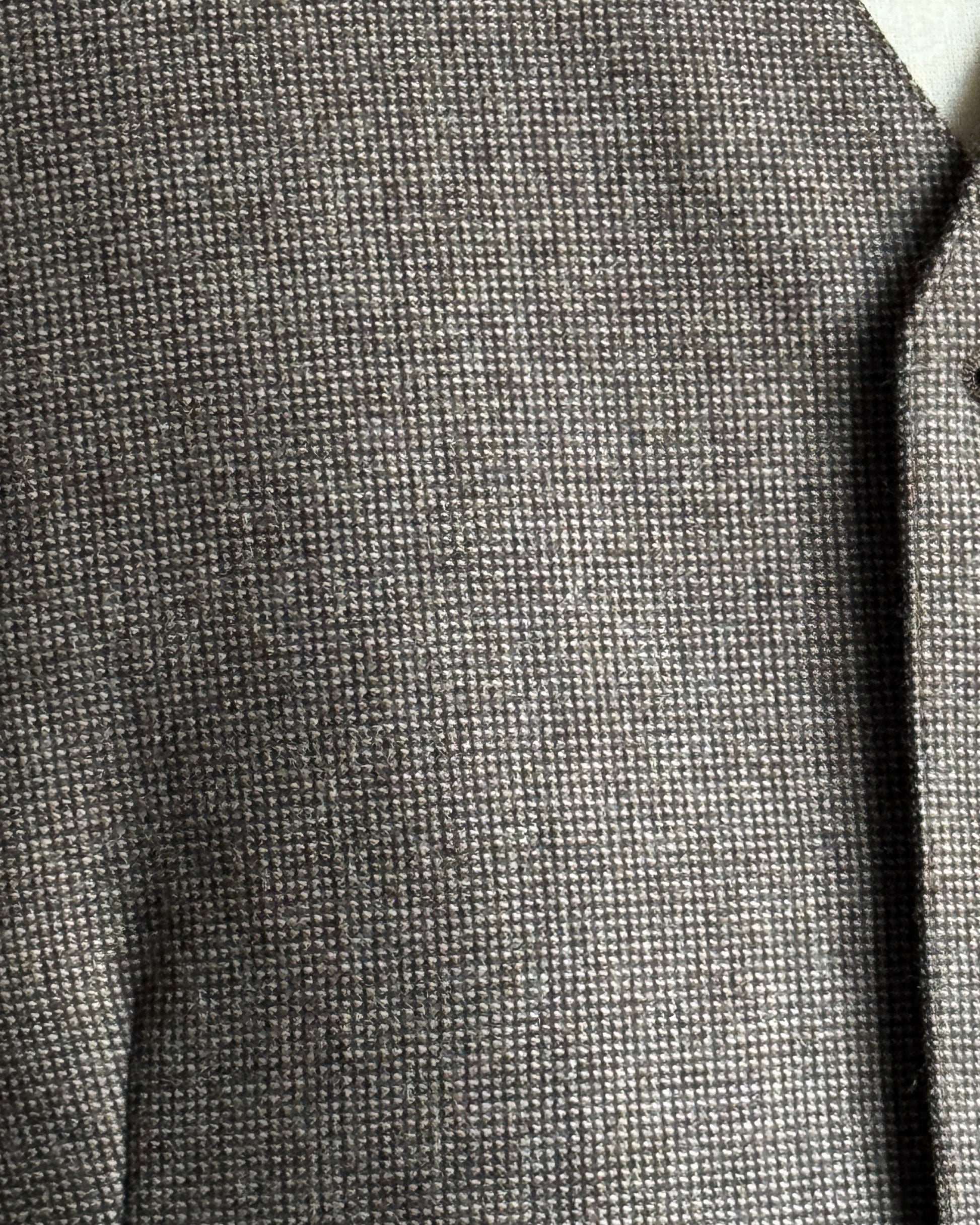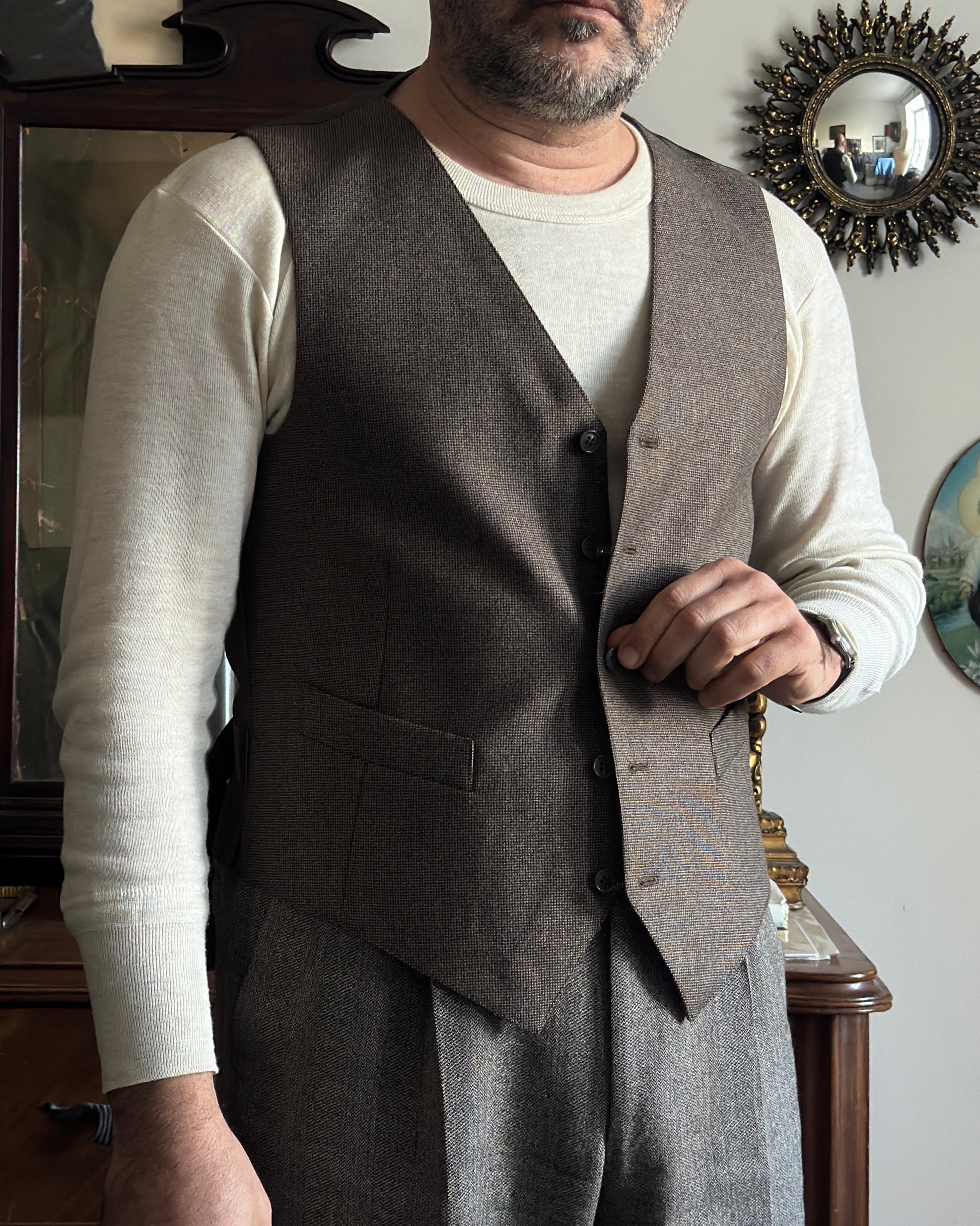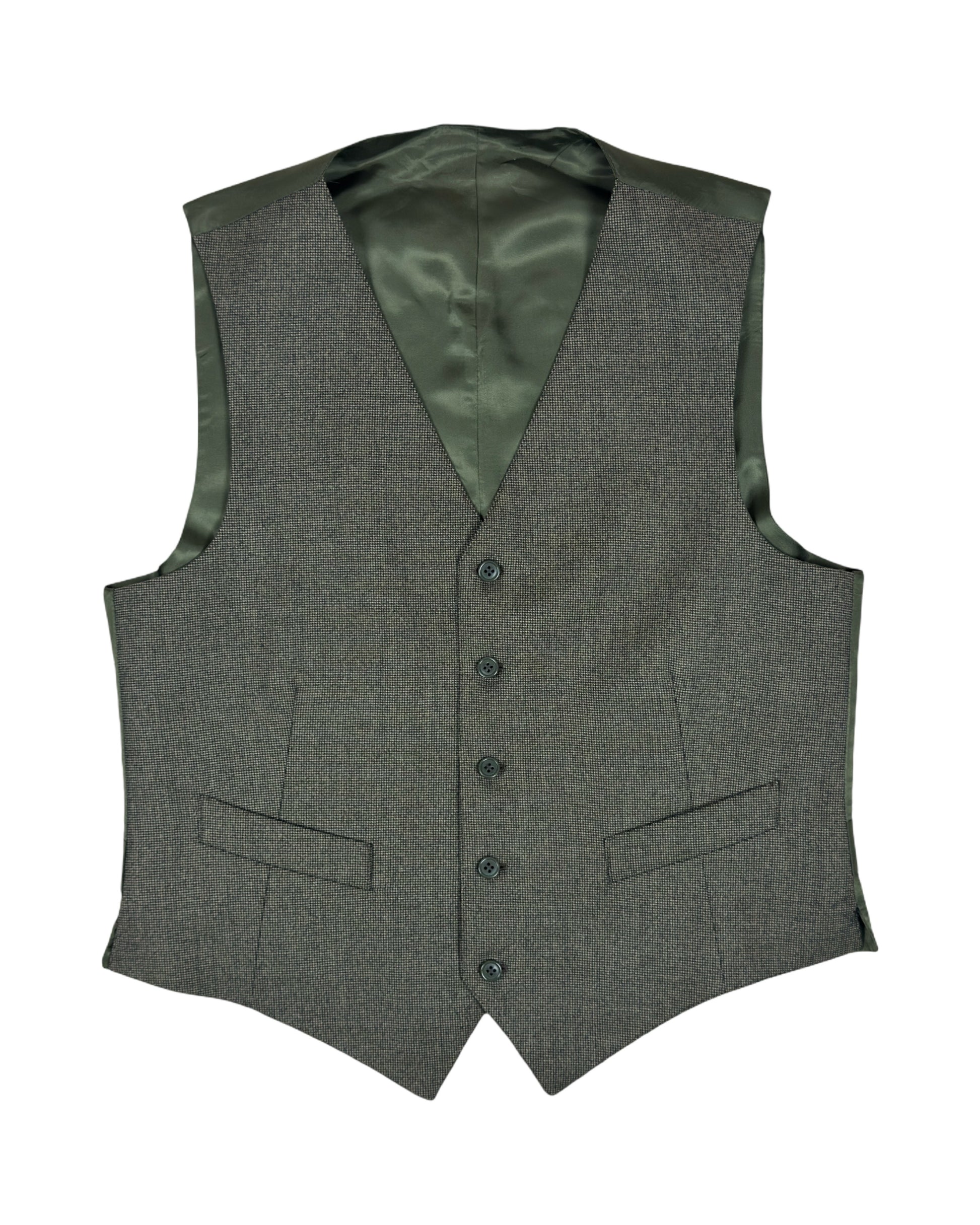 Elegante panciotto vintage in lana grigio medio, caratterizzato da una delicata micro trama che richiama l'effetto tweed. La silhouette classica è completata da una pratica chiusura a cinque bottoni e da raffinate tasche a filetto. Un capo senza tempo che si distingue per la qualità costruttiva e la versatilità stilistica, perfetto per chi apprezza i dettagli autentici del vintage. Ideale da indossare su camicia o maglione per un look sofisticato e ricercato.