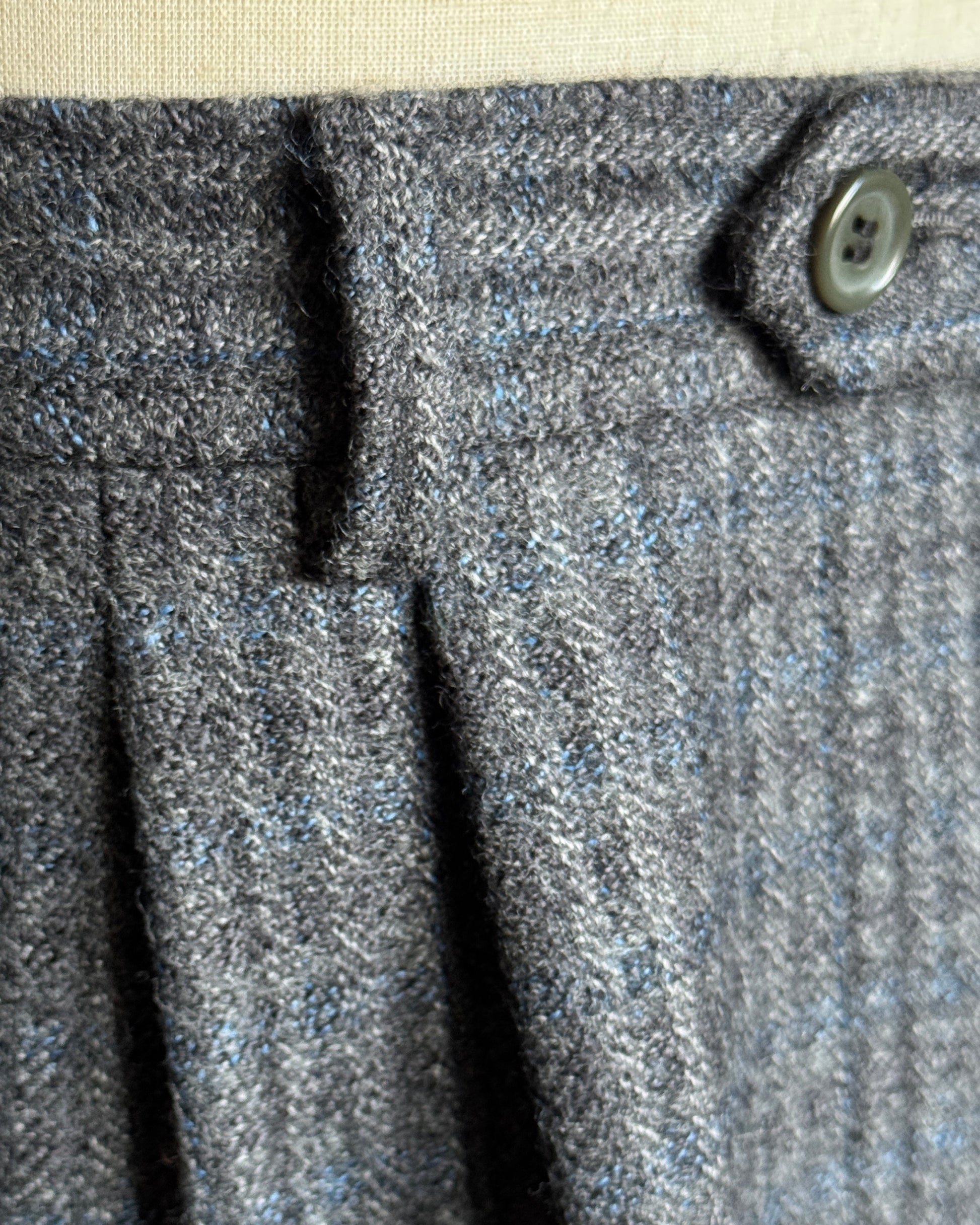 Pantalone vintage in lana pesante con doppia pence, realizzato in grammatura robusta che garantisce durabilità nel tempo. Caratterizzato da tasche posteriori con pattine, dettaglio tipico dell'abbigliamento classico. Colore grigio con quadro blu, una combinazione sofisticata che conferisce eleganza discreta. Perfetto per chi ricerca qualità sartoriale e carattere vintage. Ideale per uno stile consapevole e ricercato.