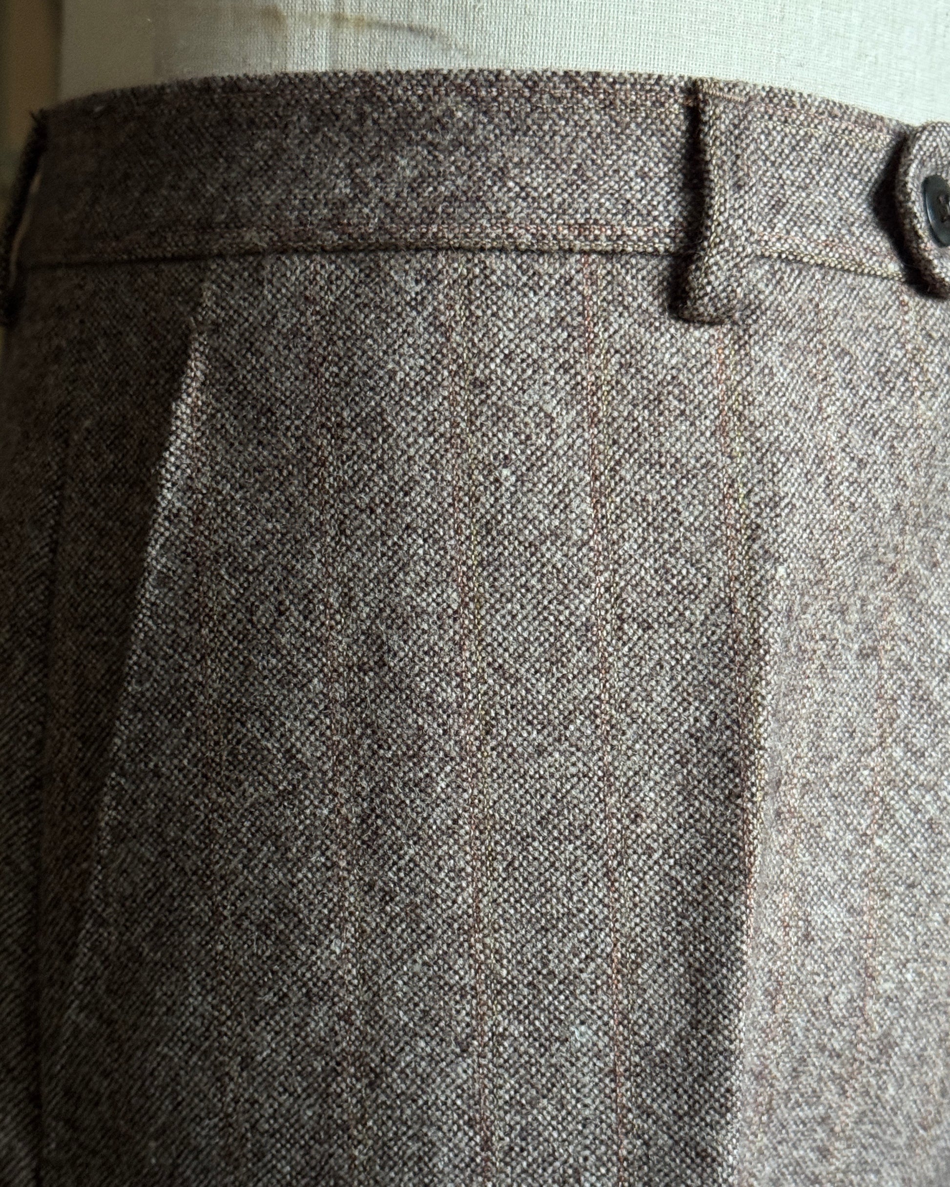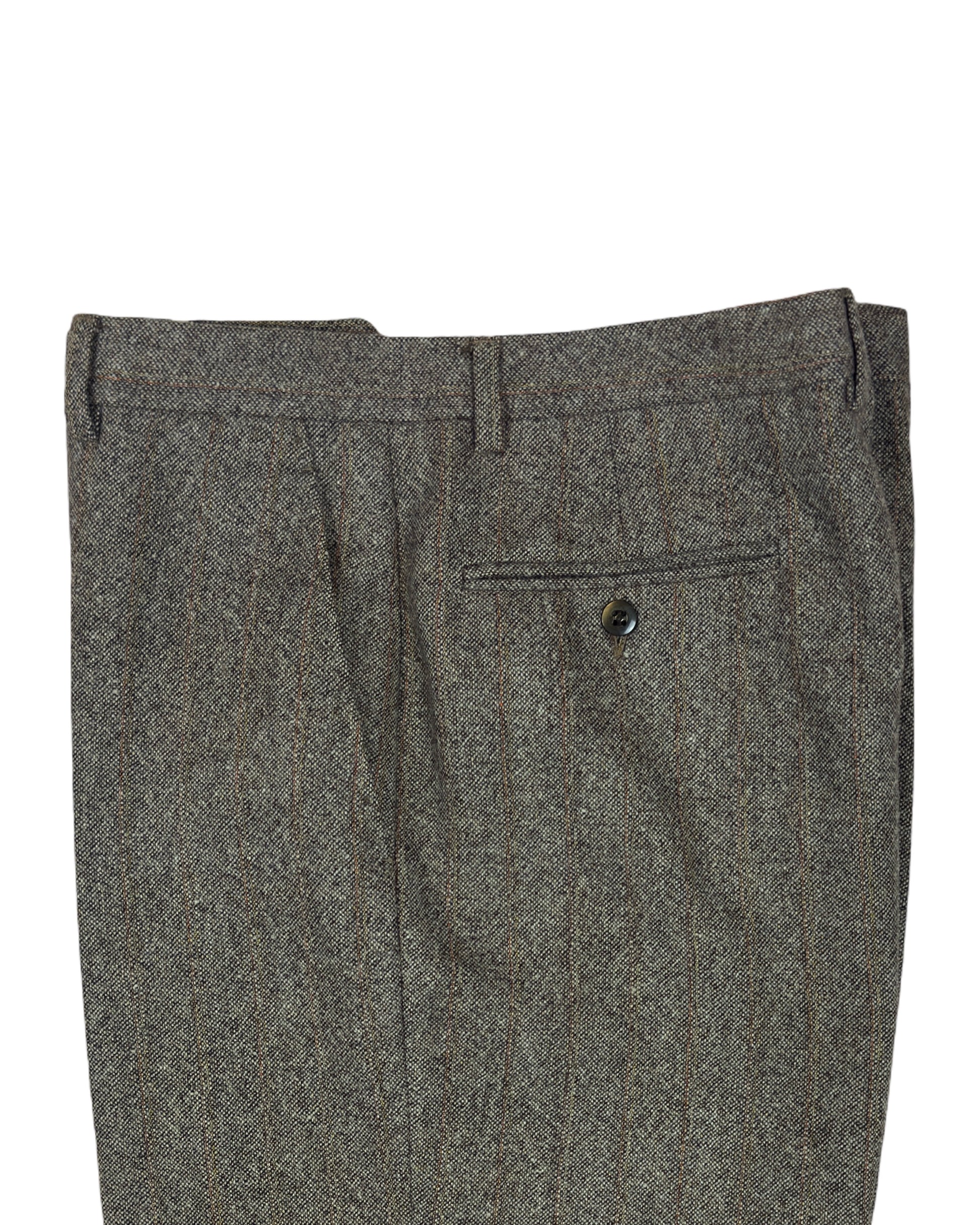 Pantalone in pura lana con una raffinata trama melange beige, impreziosito da un delicato rigo di colore ruggine che conferisce carattere e profondità al capo. La qualità della fibra garantisce comfort e durabilità nel tempo, mentre la tonalità neutra lo rende versatile per molteplici abbinamenti. Un pezzo vintage che unisce eleganza sartoriale e praticità, ideale per chi apprezza i dettagli costruttivi e la solidità dei capi d'epoca.