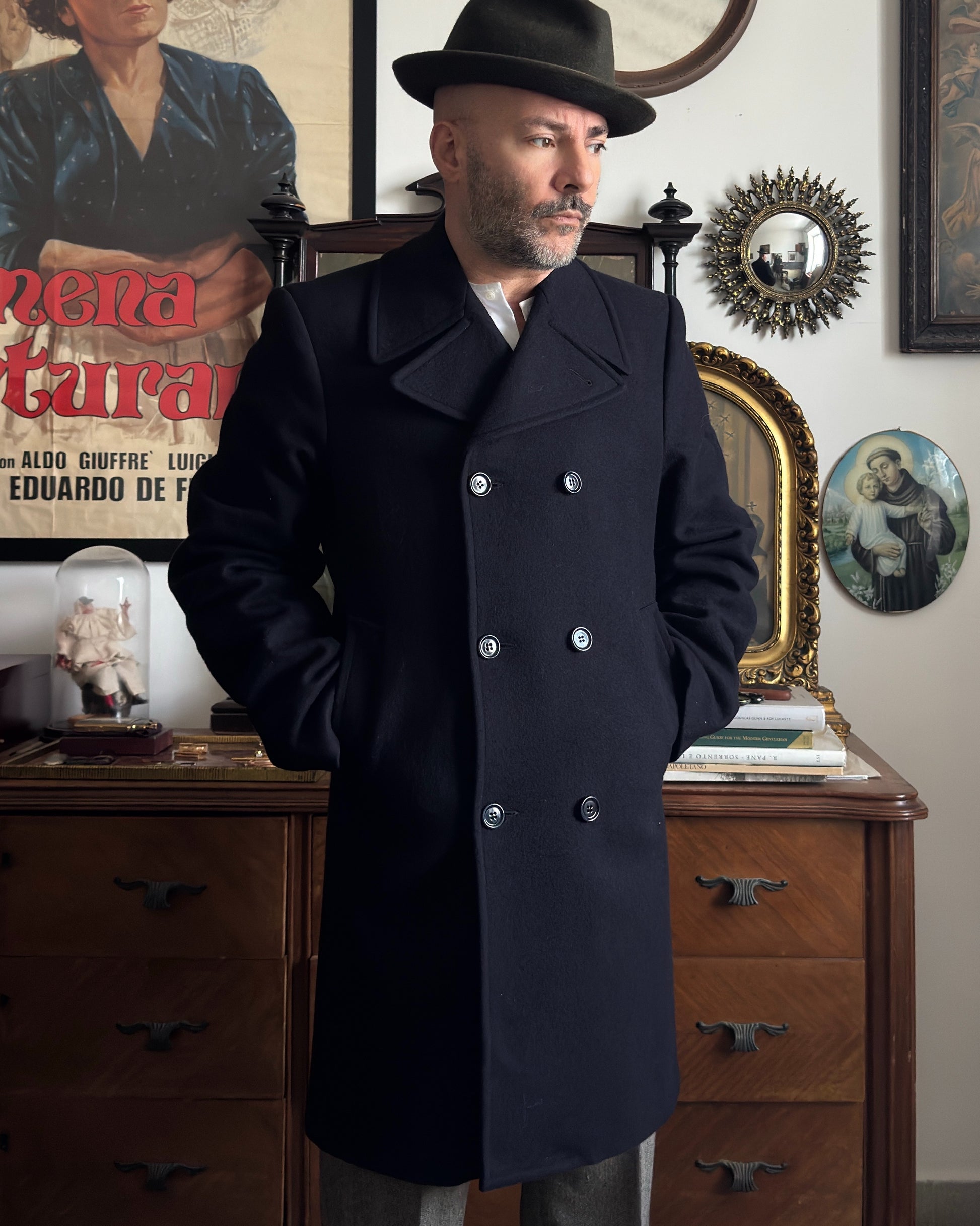 Elegante peacoat della Marina Italiana in lana, caratterizzato dal classico doppio petto a sei bottoni. Questo modello si distingue per la silhouette leggermente più lunga rispetto al tradizionale peacoat, garantendo una copertura generosa e una proporzione moderna. La costruzione robusta e i dettagli autentici riflettono l'eredità militare del capo, rendendolo un pezzo versatile per chi apprezza l'abbigliamento vintage di qualità. Ideale per chi ricerca un cappotto dallo stile senza tempo con un tocco di sofisticatezza navale.