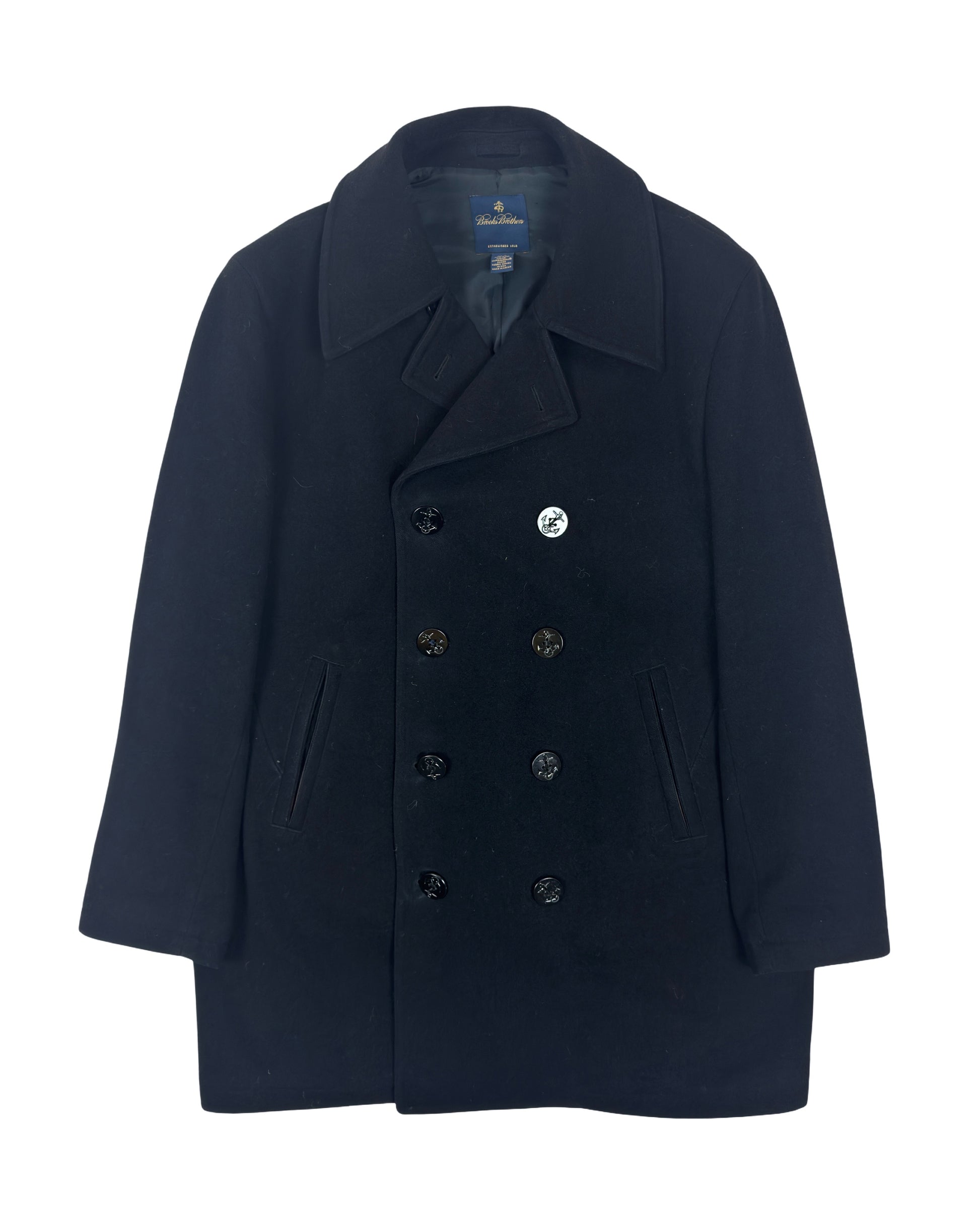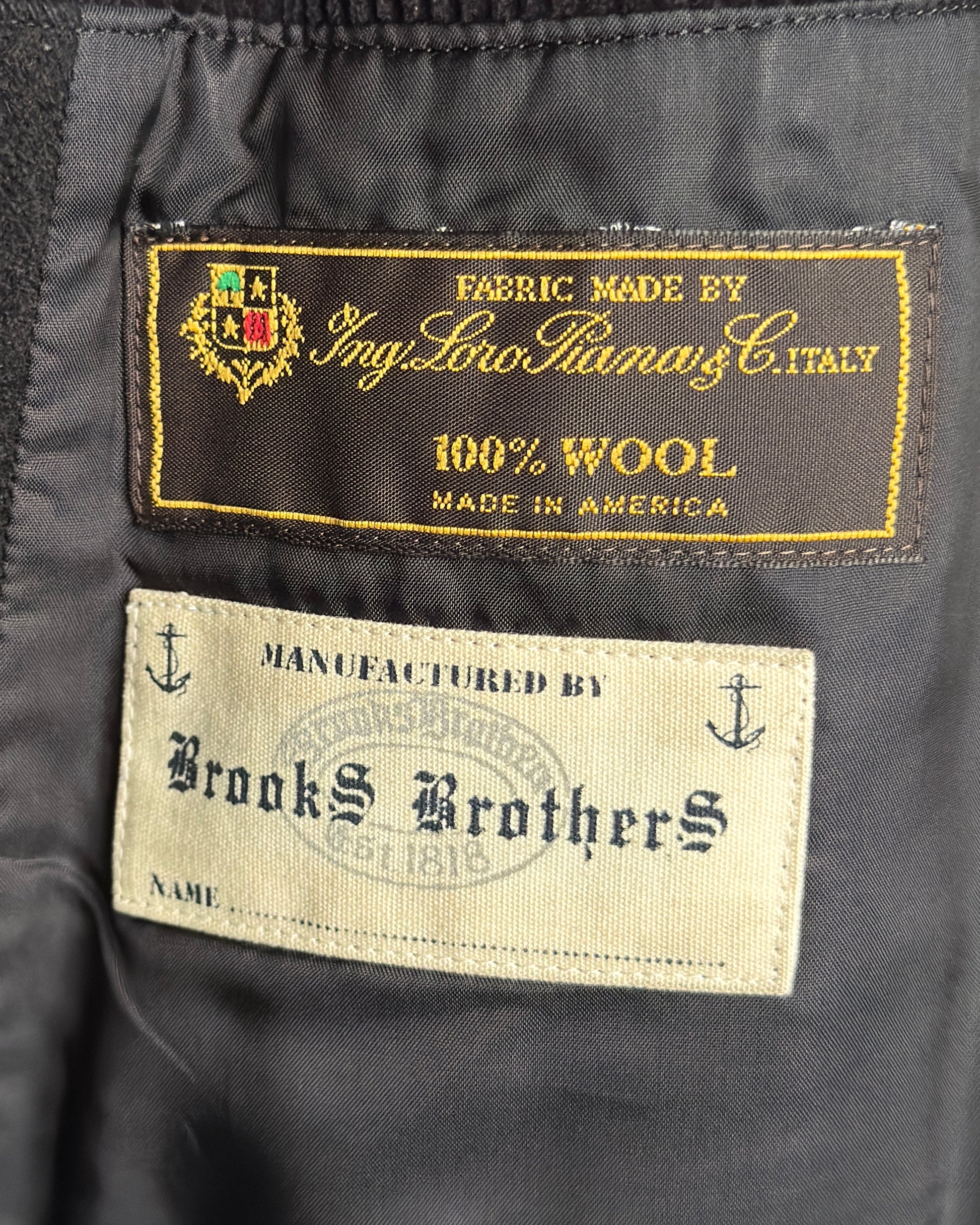 Esclusivo peacoat Brooks Brothers realizzato in pregiato tessuto Loro Piana, simbolo di qualità sartoriale senza compromessi. Questo capo d'epoca presenta tasche interne rivestite in morbido velluto a coste, dettaglio che testimonia l'attenzione ai materiali nobili tipica della maison americana. La struttura classica del peacoat garantisce versatilità e longevità, perfetto per chi apprezza l'autenticità del vintage di lusso. Un investimento nel tempo che unisce eleganza formale e comfort quotidiano.