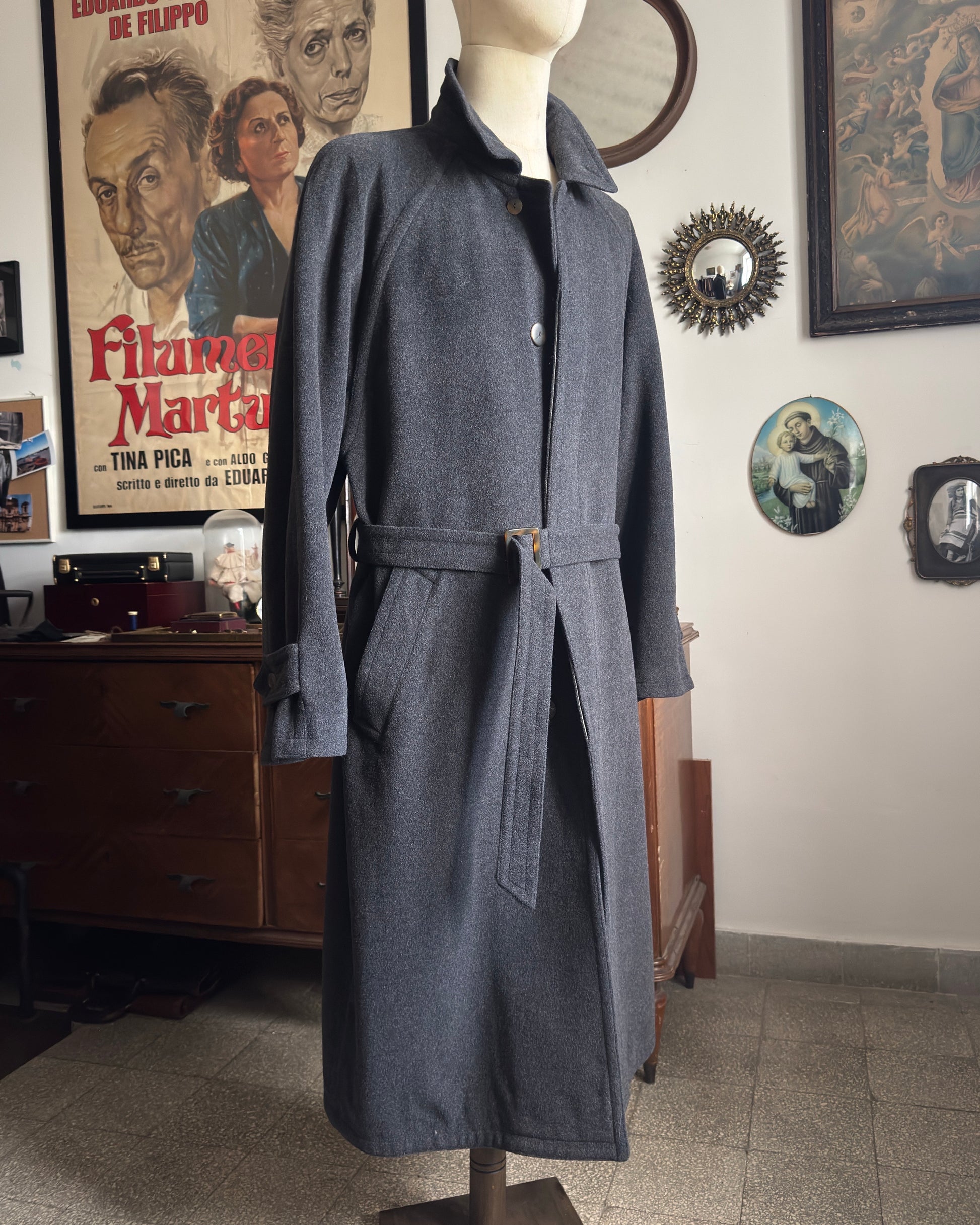 Elegante cappotto vintage in pura lana grigia, caratterizzato dalla pratica spalla raglan che garantisce libertà di movimento e comfort superiore. La cintura strutturata in vita definisce la silhouette con stile classico, mentre la lunghezza generosa offre copertura totale e un'allure sofisticata. Un pezzo senza tempo che combina qualità costruttiva e versatilità, perfetto per chi apprezza l'autenticità del vintage e la ricerca di dettagli curati.
