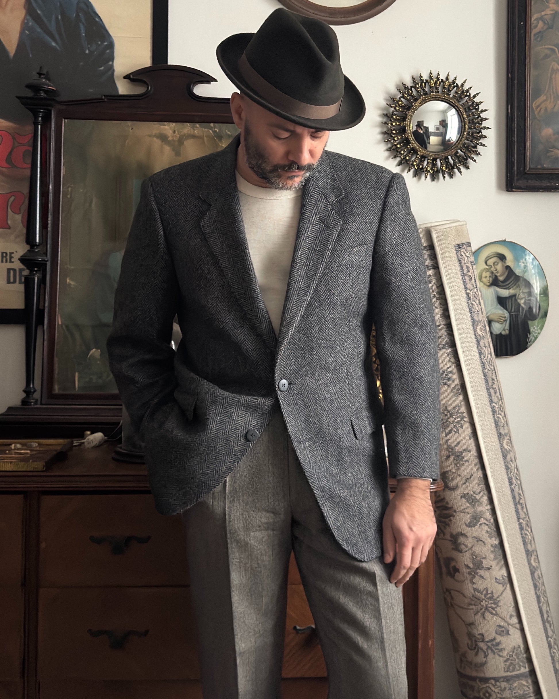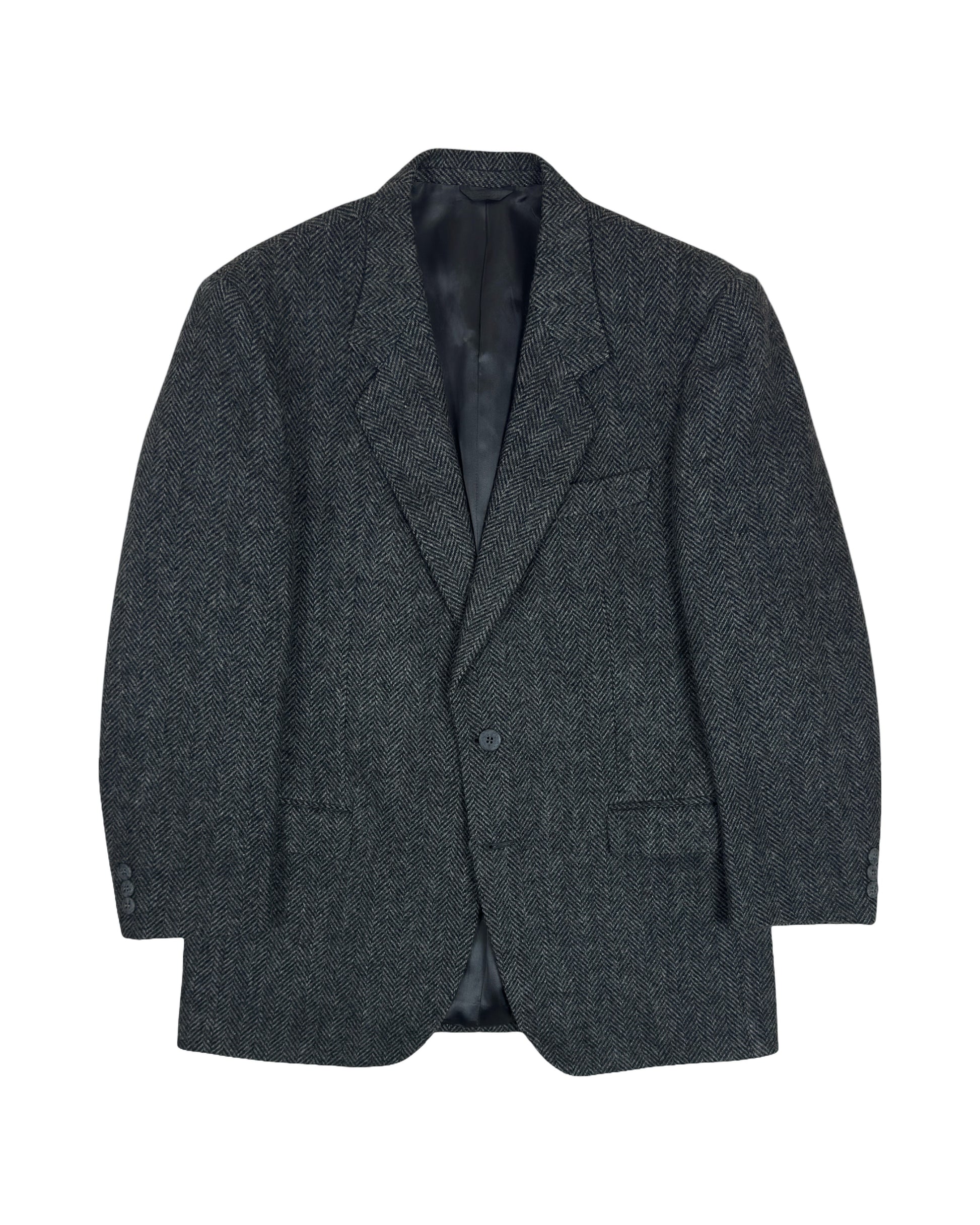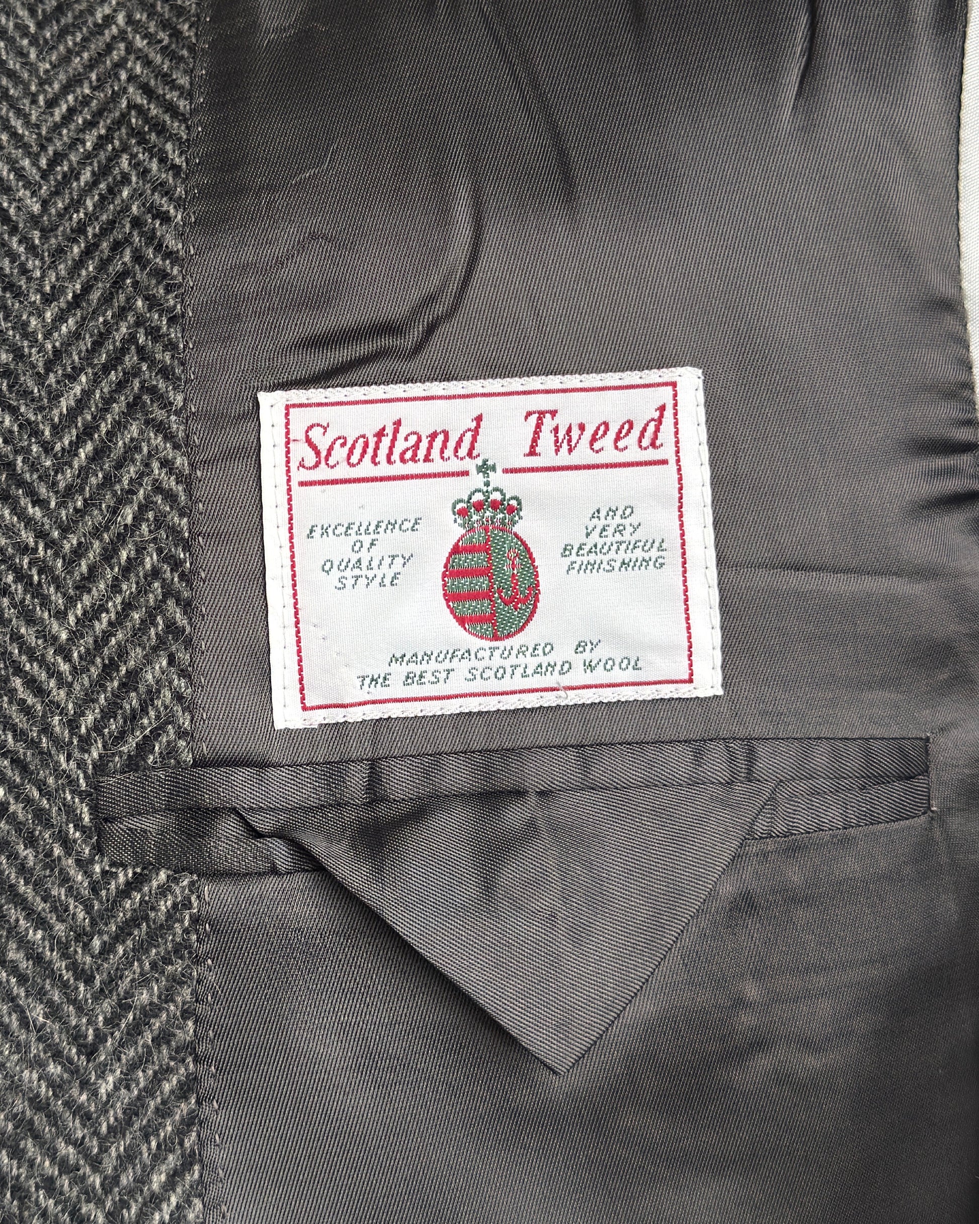Giacca in pura lana Irish Tweed con caratteristico motivo a spigato, un classico intramontabile della sartoria britannica. Realizzata con due bottoni funzionali e taglio senza spacco laterale, garantisce una silhouette pulita e raffinata. La lana Irish Tweed offre eccezionale resistenza e calore, mantenendo una notevole leggerezza. Perfetta per chi apprezza l'autenticità del vintage e la qualità costruttiva di un capo senza tempo.
