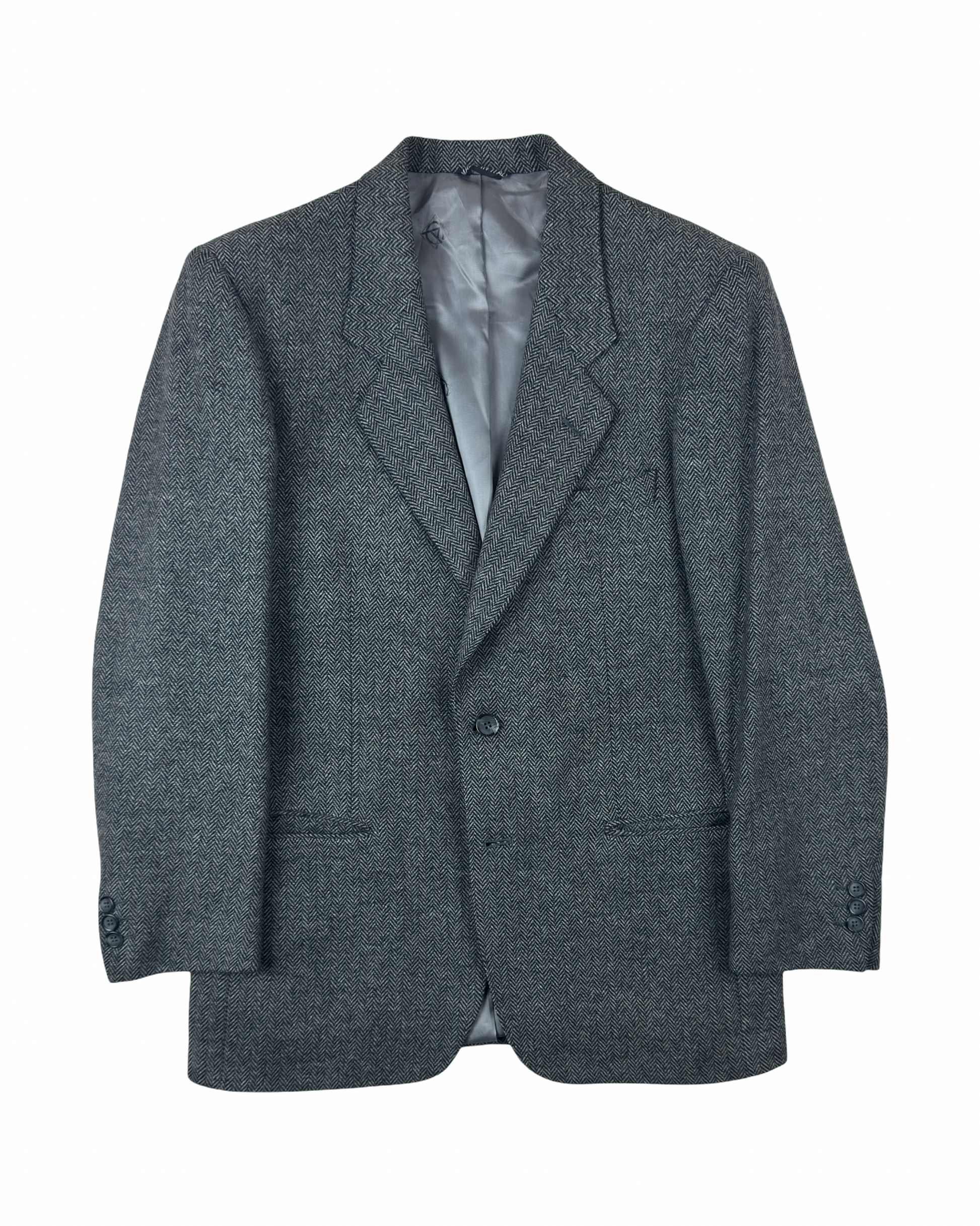 Raffinata giacca vintage in lana con elegante motivo spigato grigio. Progettata con due bottoni e priva di spacchi laterali per una silhouette pulita e sartoriale. Completamente fodera interna, realizzata con un pregiato blend di lana. Taglia 48 in condizioni eccellenti. Grammatura pesante, perfetta per la stagione invernale.