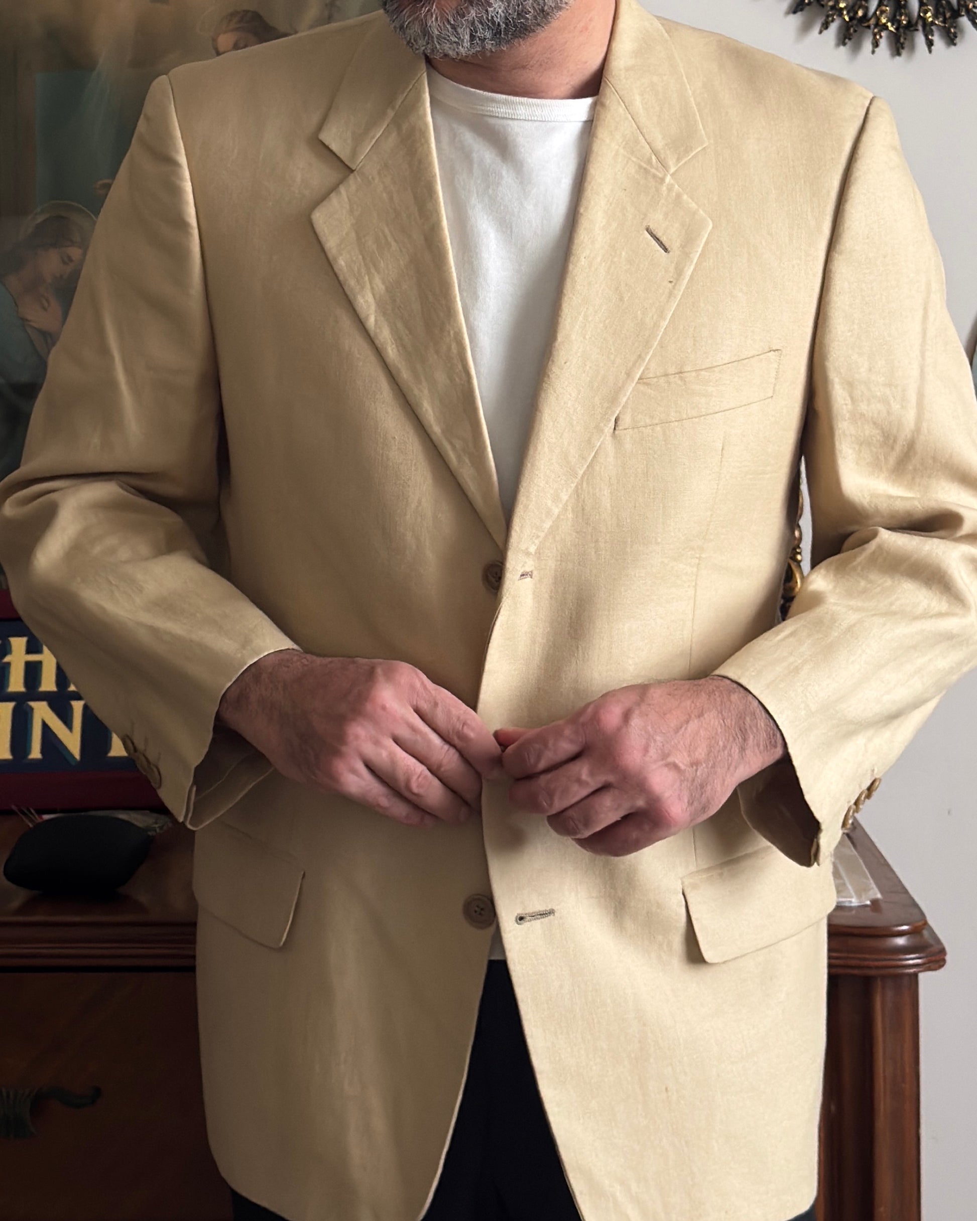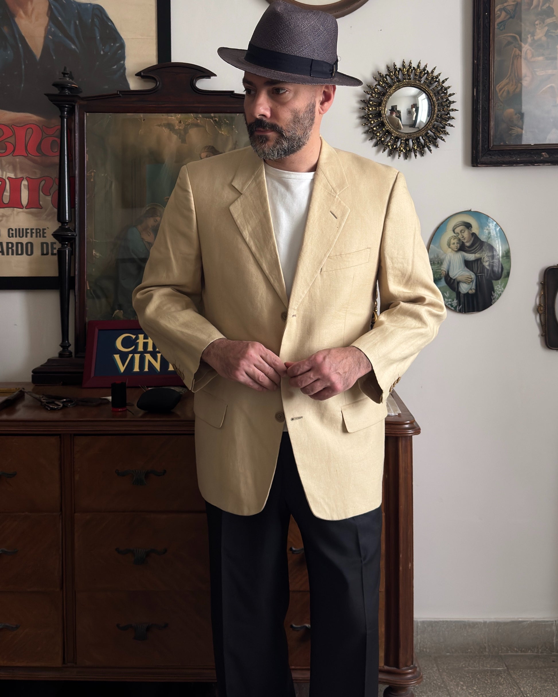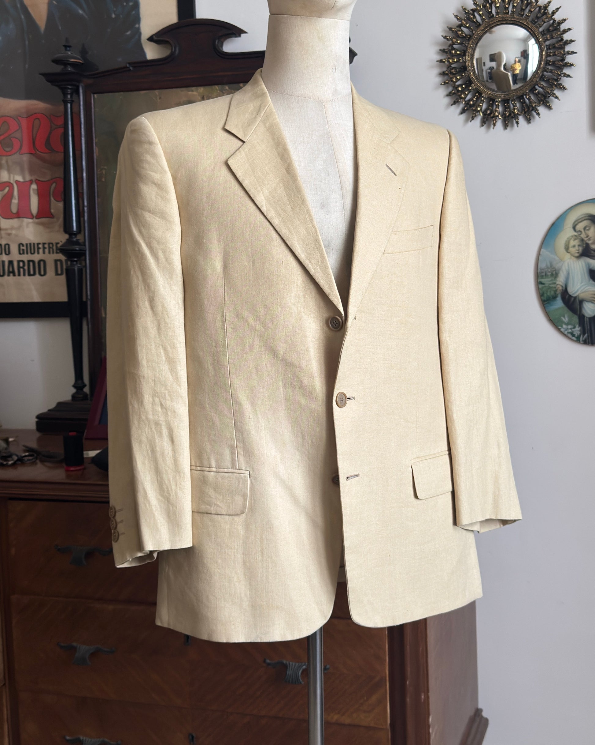 Elegante giacca vintage in puro lino beige, perfetta per la stagione estiva. Chiusura con tre bottoni, doppio spacco laterale e semi fodera interna. Condizioni eccellenti, igienizzata a secco. Grammatura leggera ideale per il caldo.