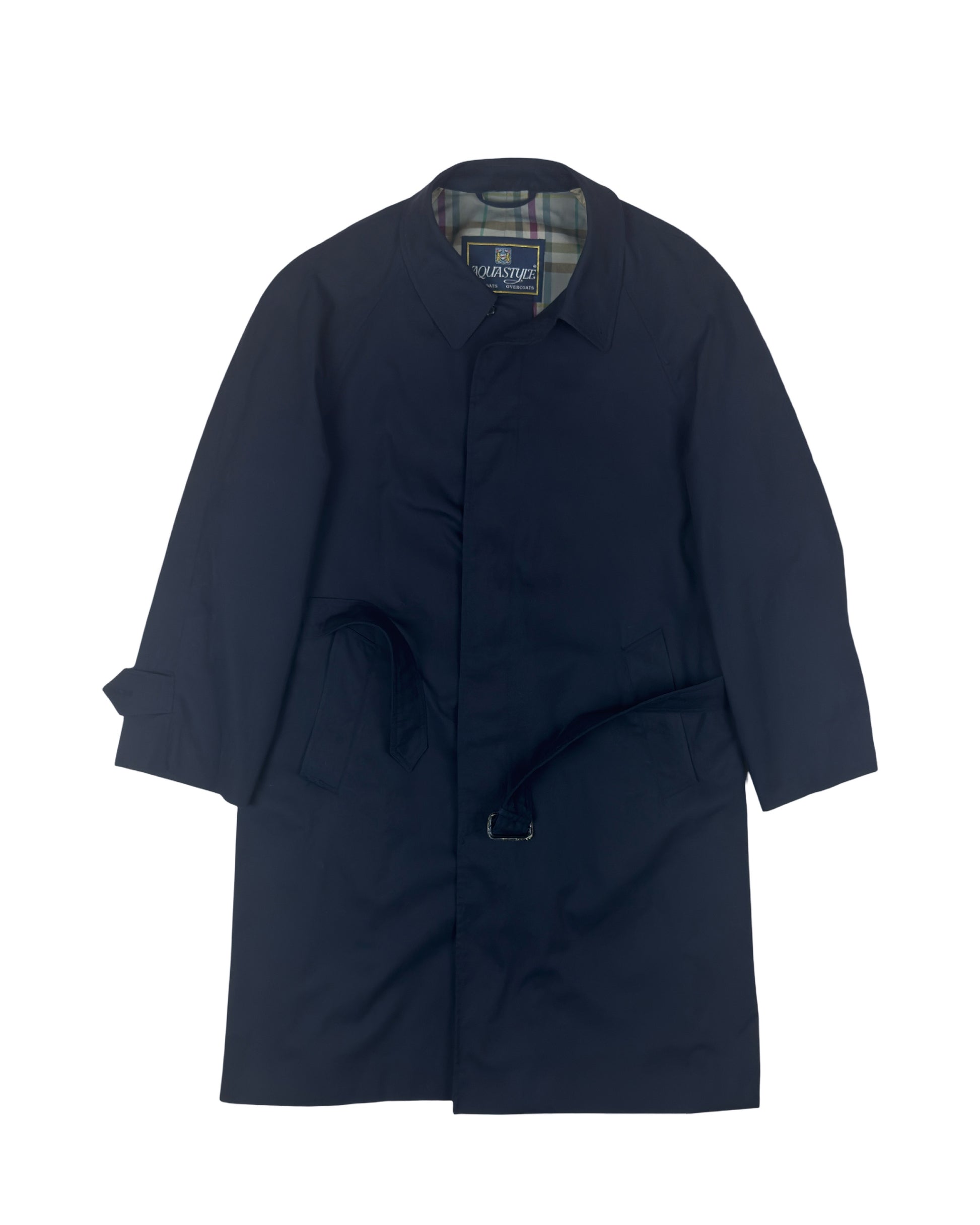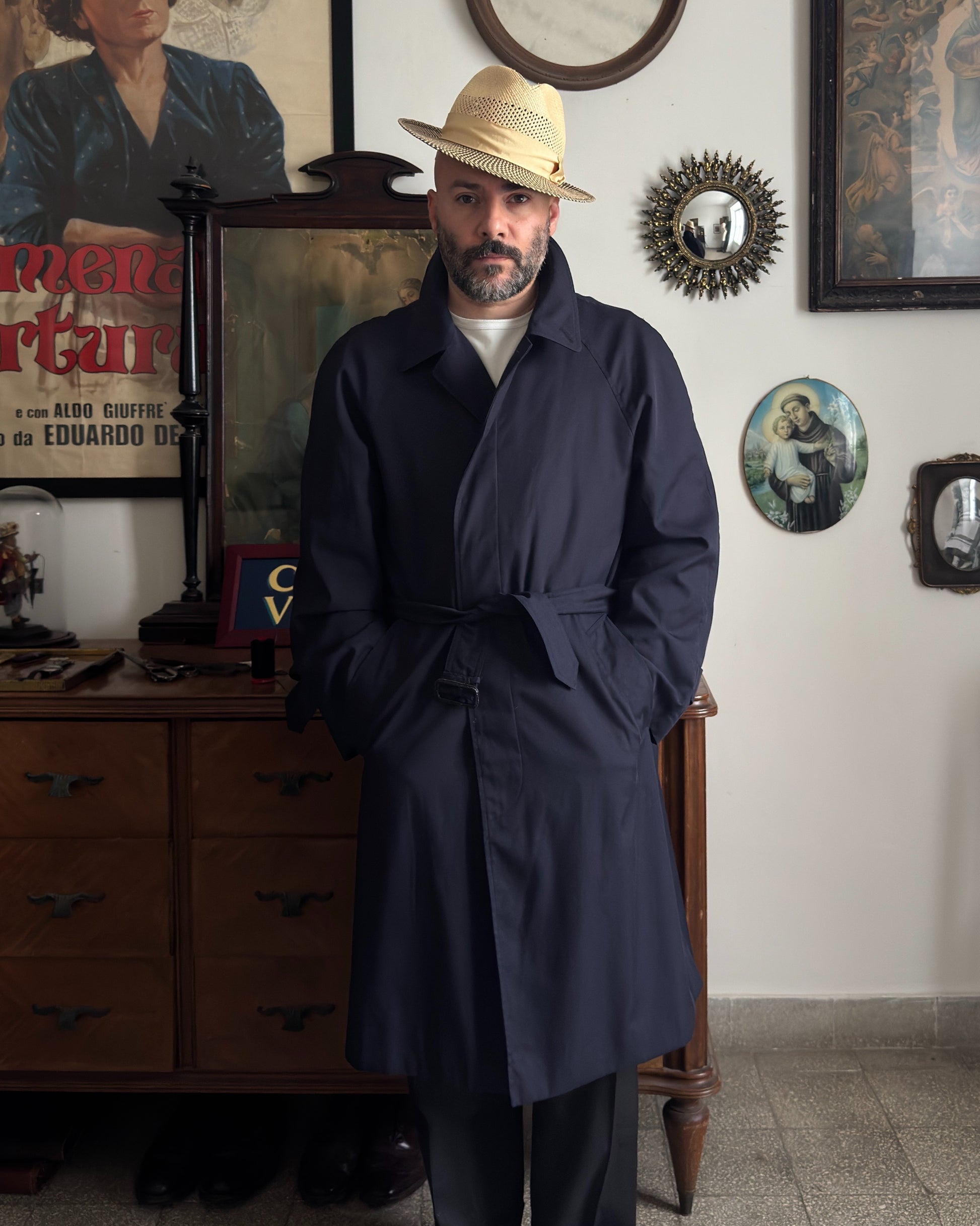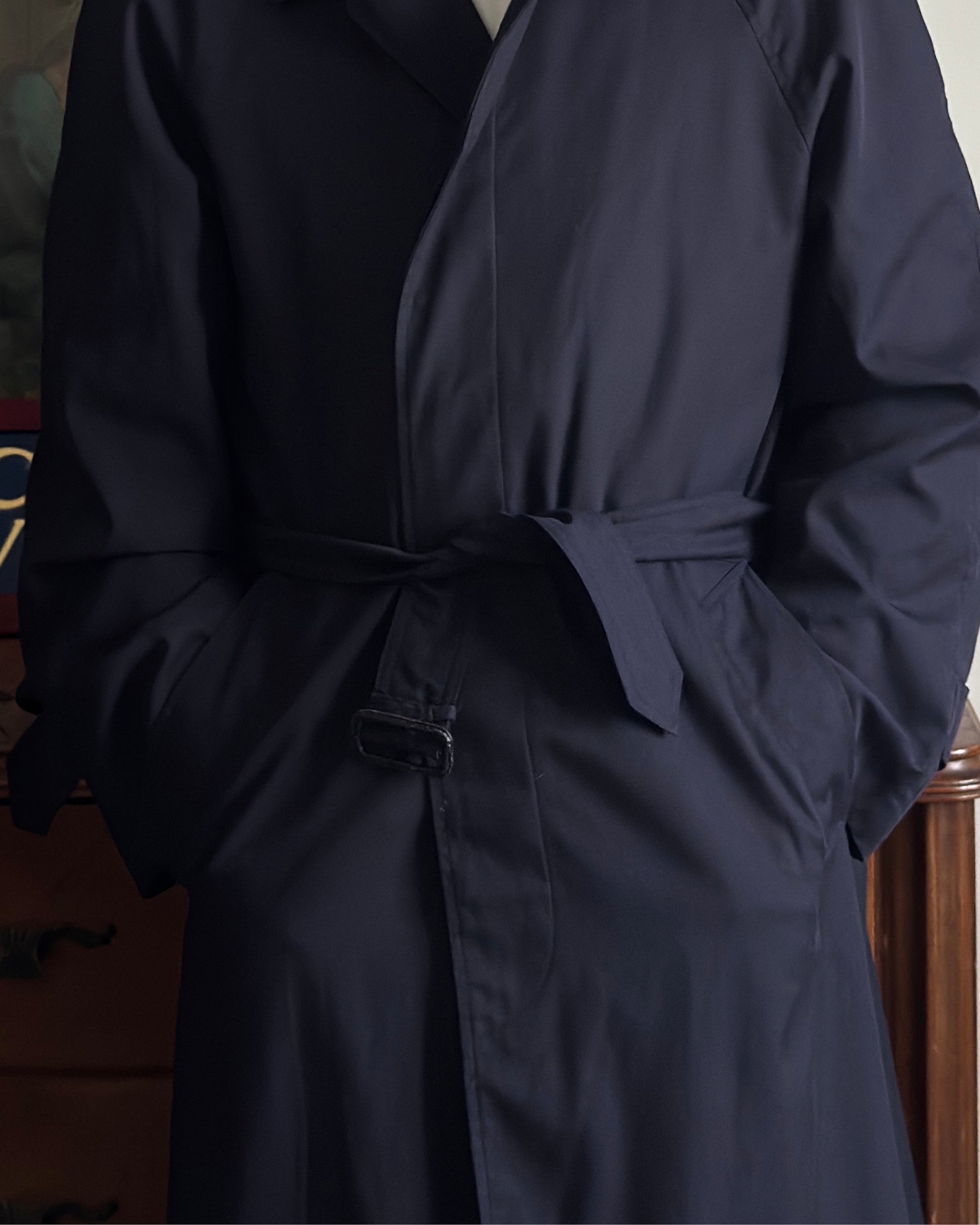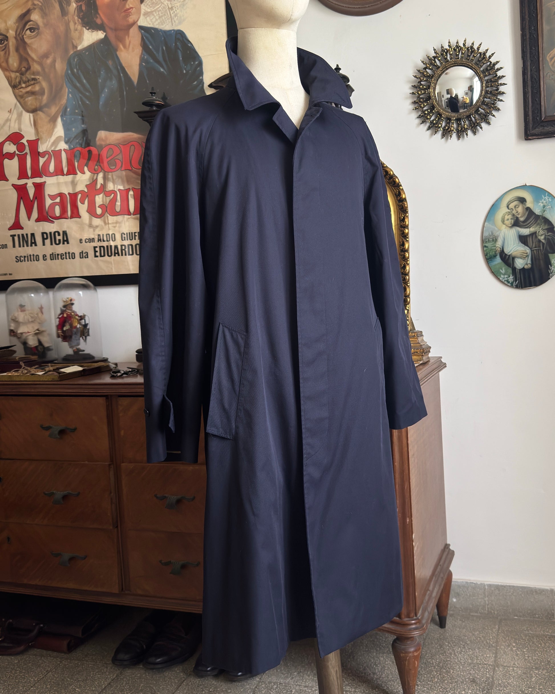 Impermeabile vintage blu in misto cotone con spalle raglan e cintura. Collo camicia, petto singolo con bottoni, due tasche laterali.
