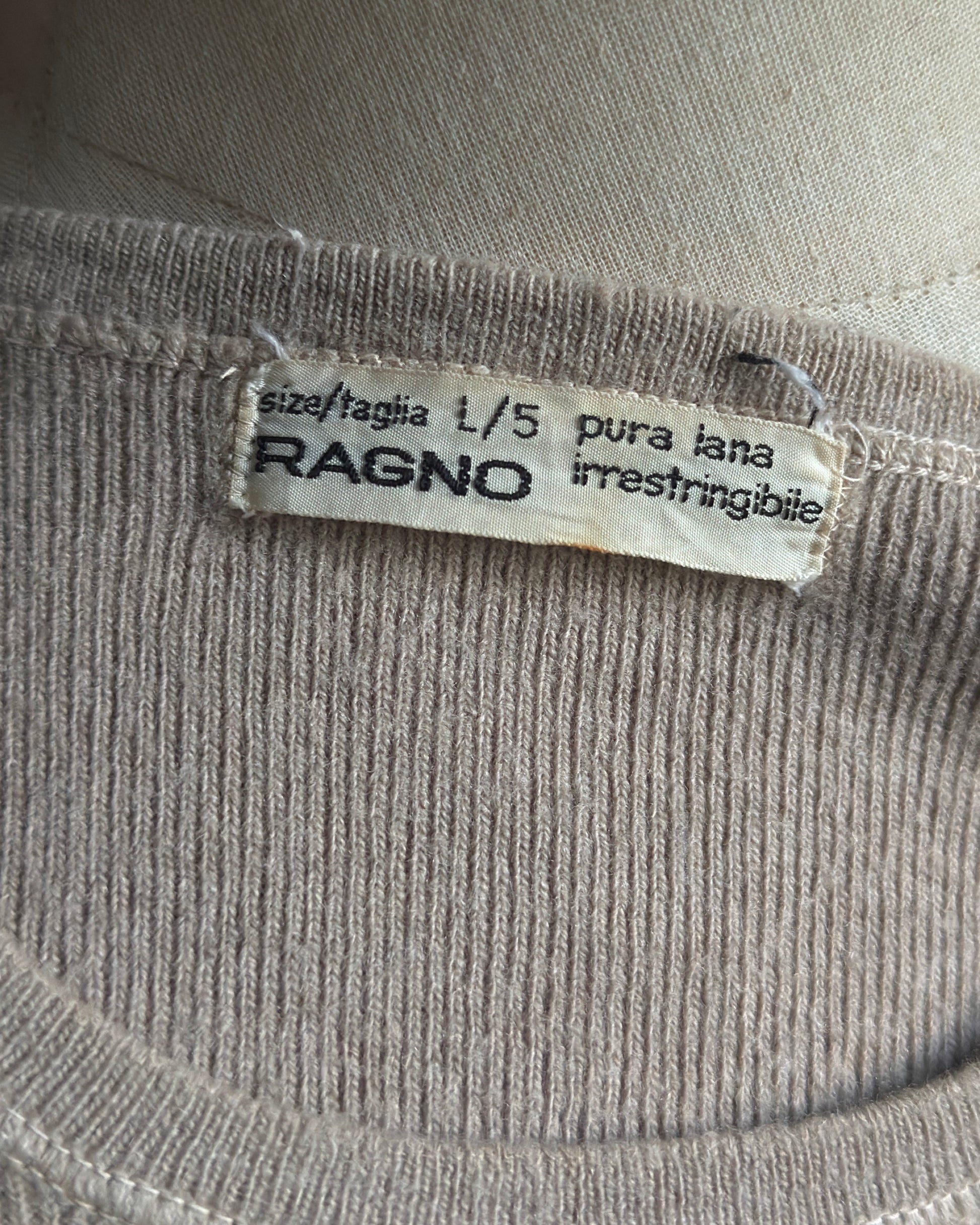 Maglia intima vintage del marchio Ragno, realizzata in lana pregiata. Questo capo rappresenta un esempio autentico della qualità costruttiva italiana degli anni passati, caratterizzato da una fibra naturale che garantisce isolamento termico e traspirazione. La lana utilizzata offre comfort duraturo e una sensazione morbida sulla pelle. Un pezzo da collezione per chi apprezza l'artigianalità e la solidità dei capi intimi storici, perfetto per chi ricerca autenticità e prestazioni naturali in un indumento intimo classico.
