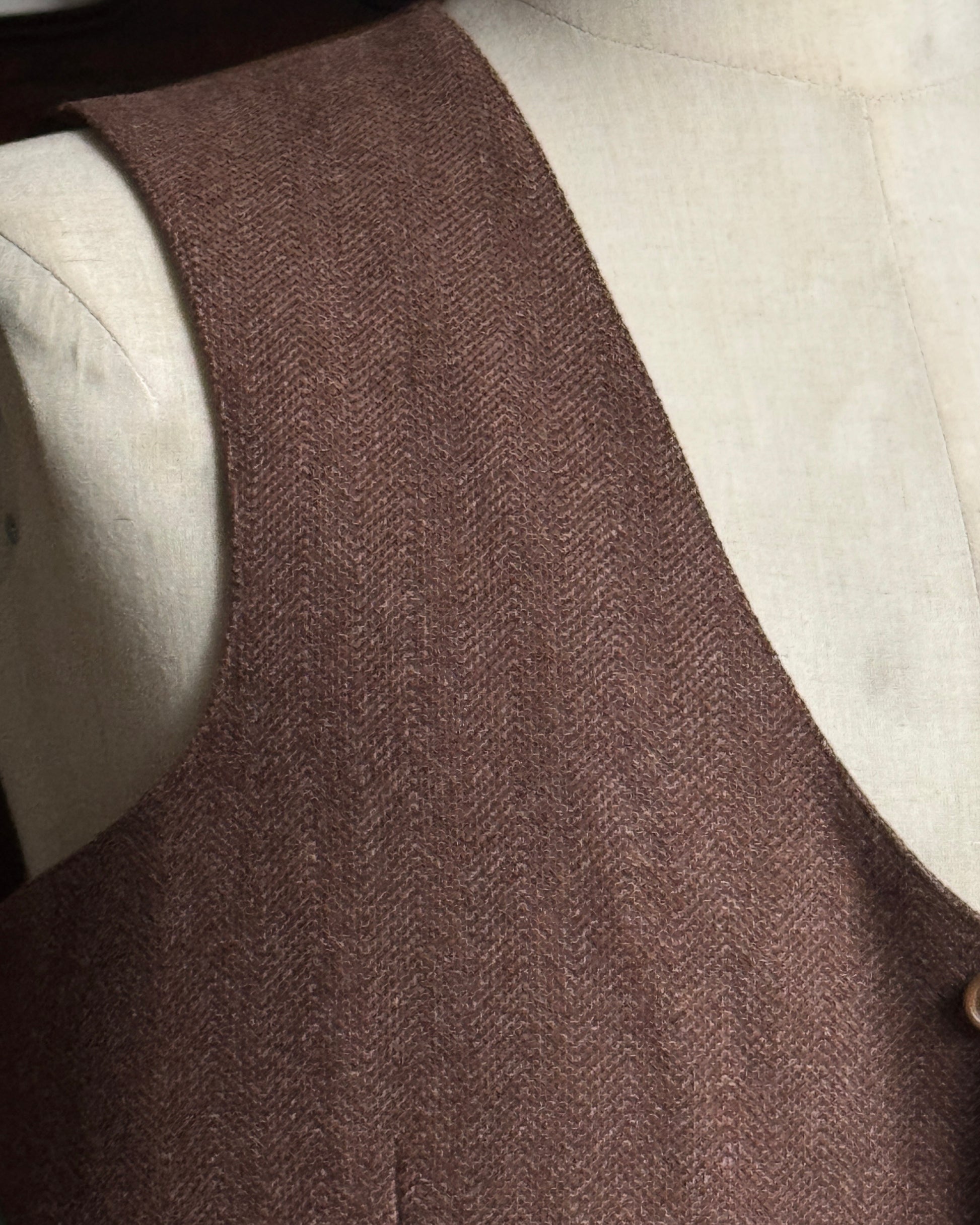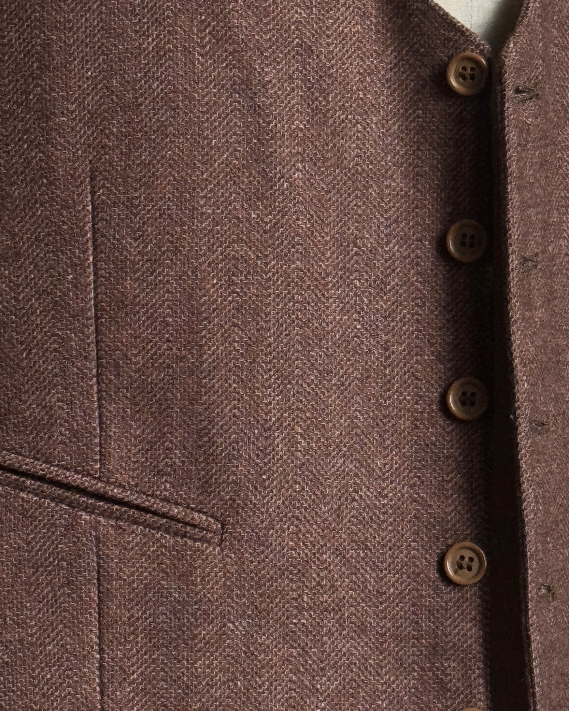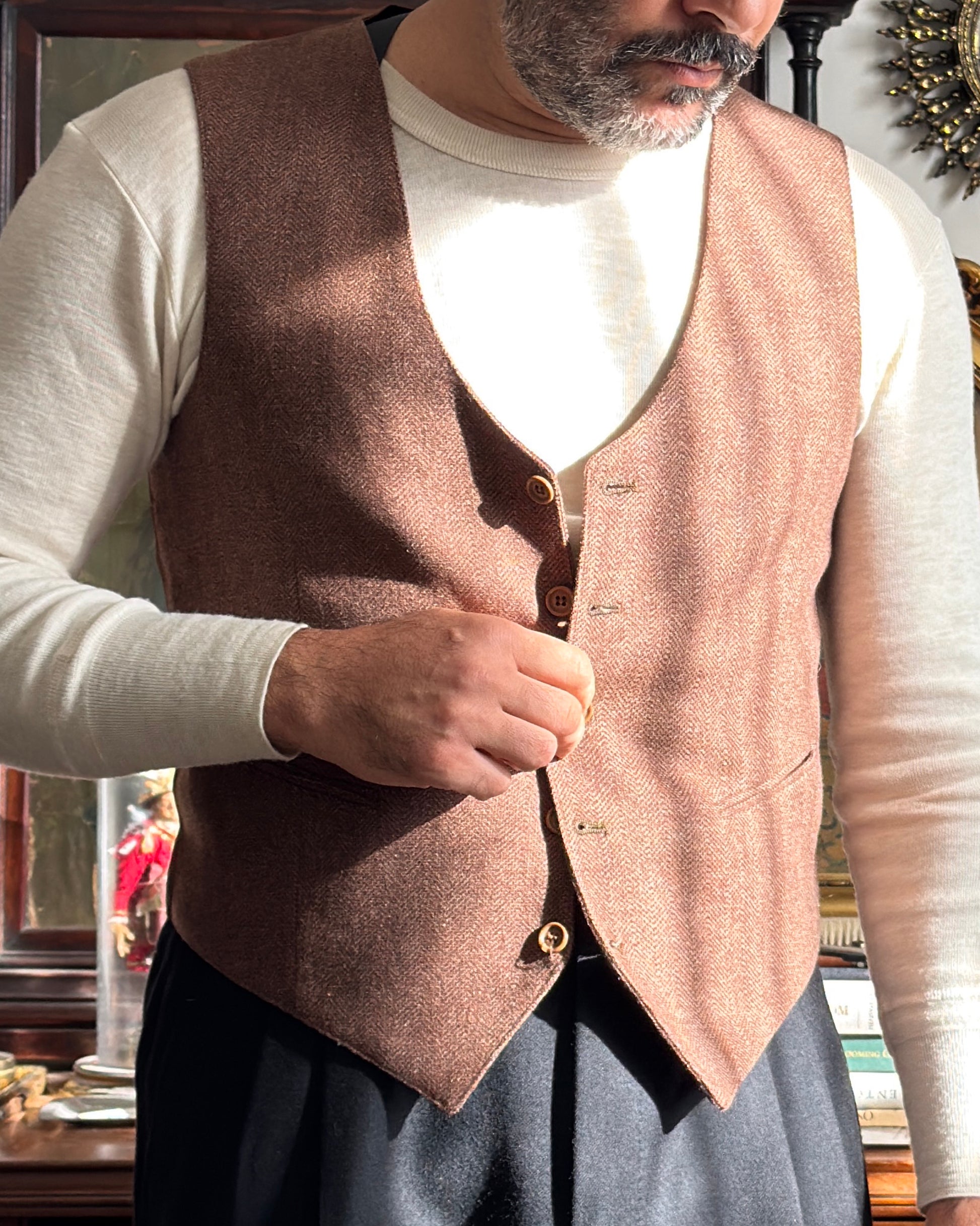 Realizzato in lana a grammatura spessa, questo panciotto vintage si distingue per il suo colore ruggine intenso e una chiusura frontale con cinque bottoni robusti, che garantiscono una vestibilità solida e sicura. Il retro liscio, privo di ganci regolabili, conferisce un aspetto pulito e lineare, mentre le due taschine anteriori aggiungono funzionalità senza compromettere l'eleganza. Una scelta ideale per chi cerca un capo dal look classico con dettagli ben curati e una costruzione affidabile.
