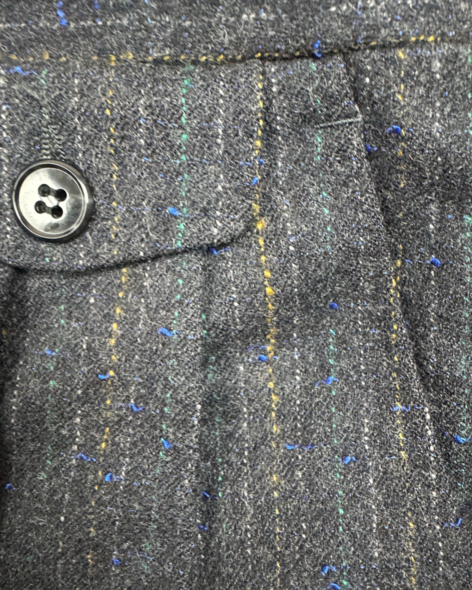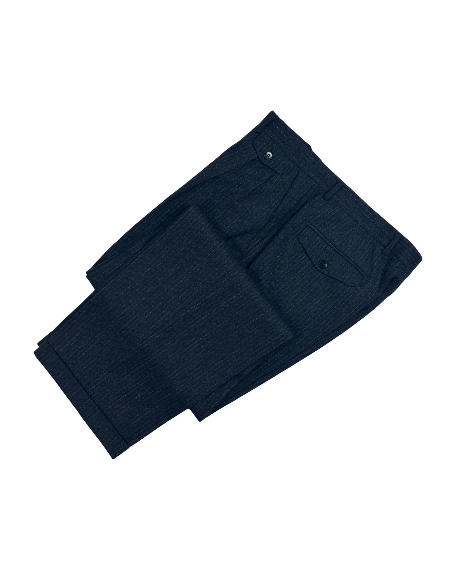 Realizzato in lana di alta qualità con grammatura pesante, questo pantalone blu scuro presenta sottili righe marroni e blu elettrico che ne esaltano l’eleganza. Dotato di tasche posteriori con pattine, tasche america e doppia pence, garantisce una vestibilità raffinata e comfort ottimale, ideale per un look sofisticato e distintivo.