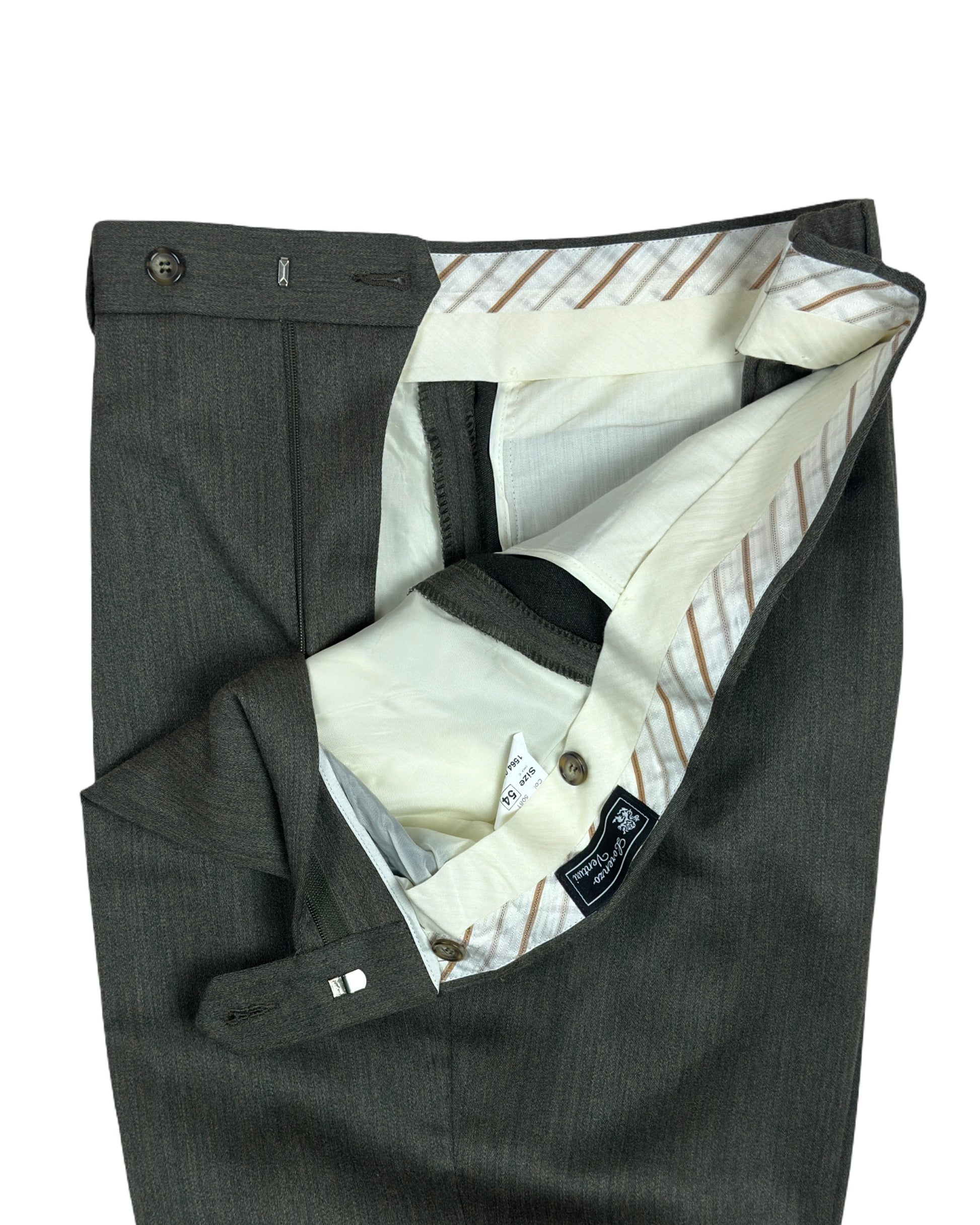 Pantalone vintage in lana lucida di qualità superiore, caratterizzato da una tonalità di verde chiaro elegante e sofisticato. Realizzato con fibre nobili che garantiscono una lucentezza naturale e un drappeggio impeccabile. Questo capo second hand rappresenta un'eccellente scelta per chi ricerca autenticità e stile senza compromessi. Perfetto per composizioni formali o casual-chic, il pantalone si distingue per la sua versatilità e la capacità di elevare qualsiasi outfit. Una pence ben definita assicura una silhouette impeccabile e una vestibilità raffinata.
