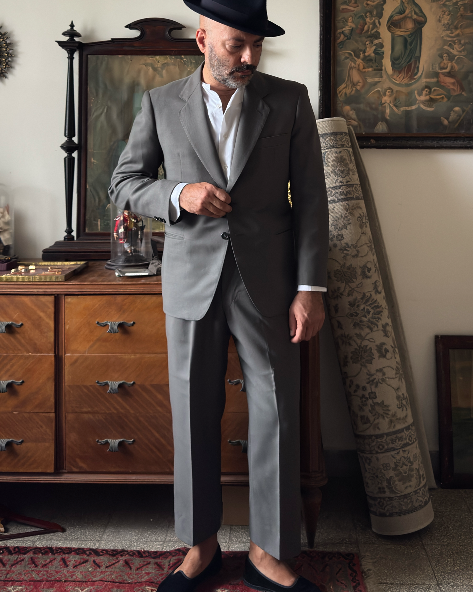 Questo vestito vintage, realizzato in lana di qualità, si distingue per la tonalità verde kaki elegante e la classica chiusura a due bottoni. Il rever (notch lapel) conferisce un tocco sofisticato, mentre l'assenza di spacco sul retro garantisce una linea pulita e strutturata. Il pantalone abbinato presenta una doppia pence che valorizza la sagoma, offrendo un equilibrio ideale tra comfort e stile raffinato. Perfetto per chi cerca un capo senza tempo con dettagli di grande carattere.