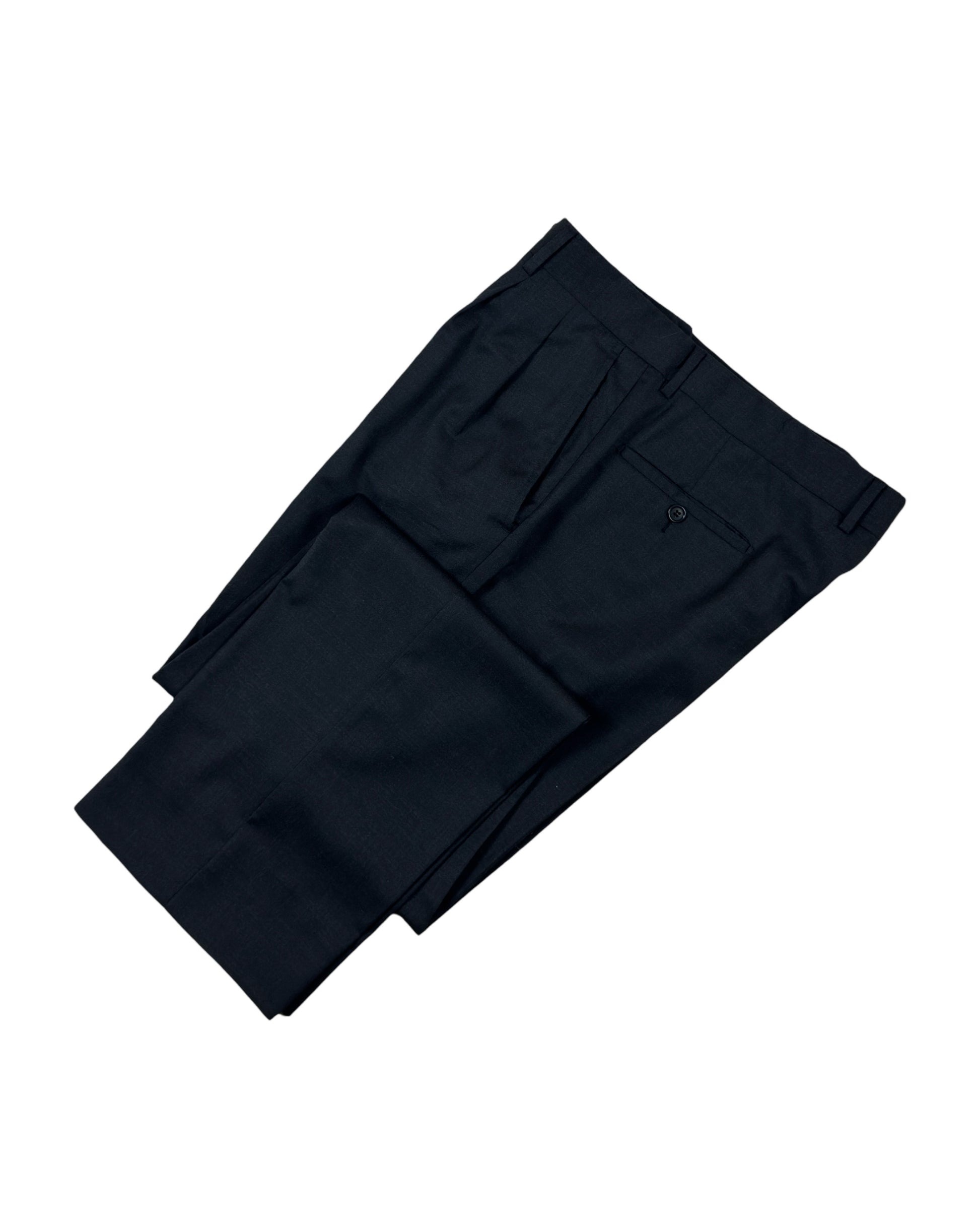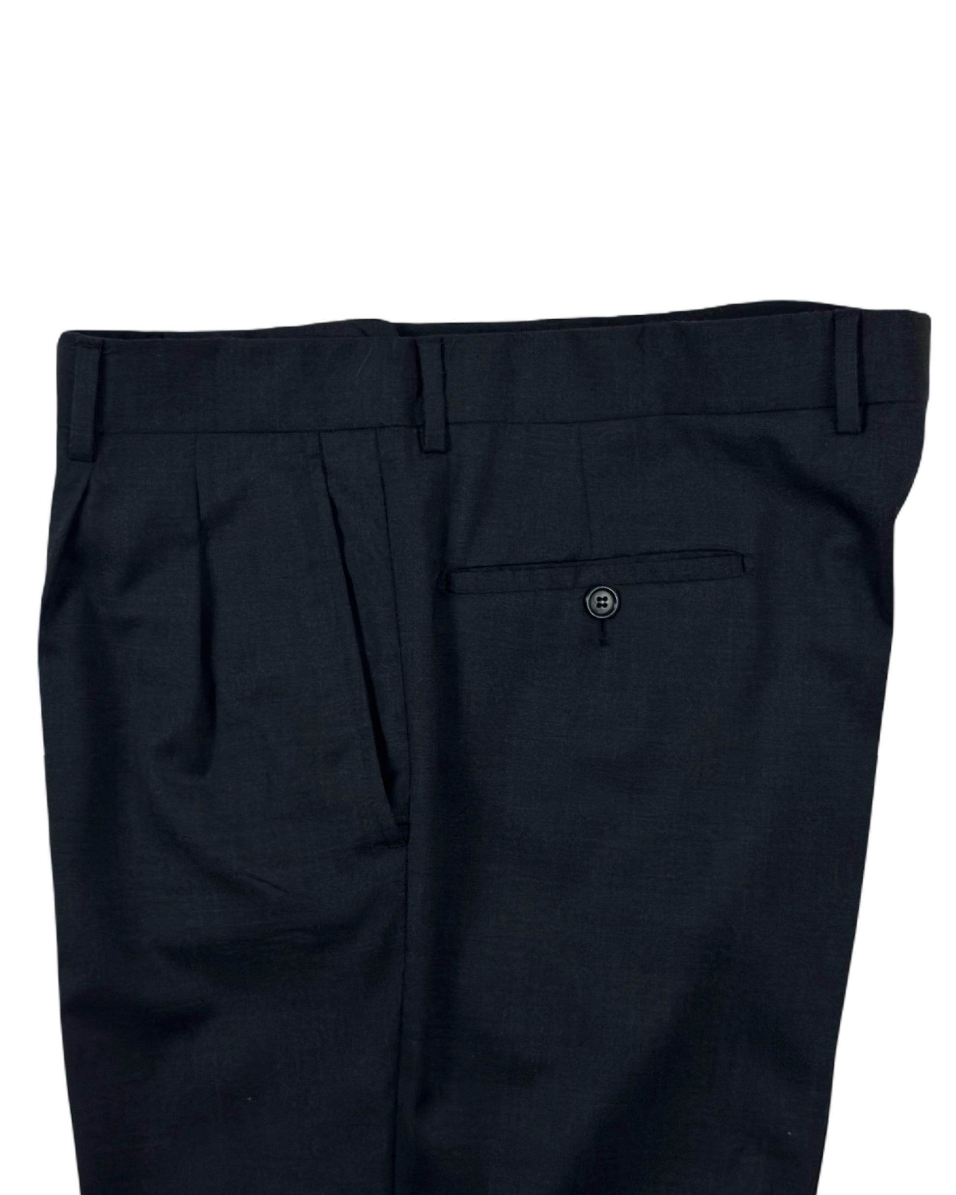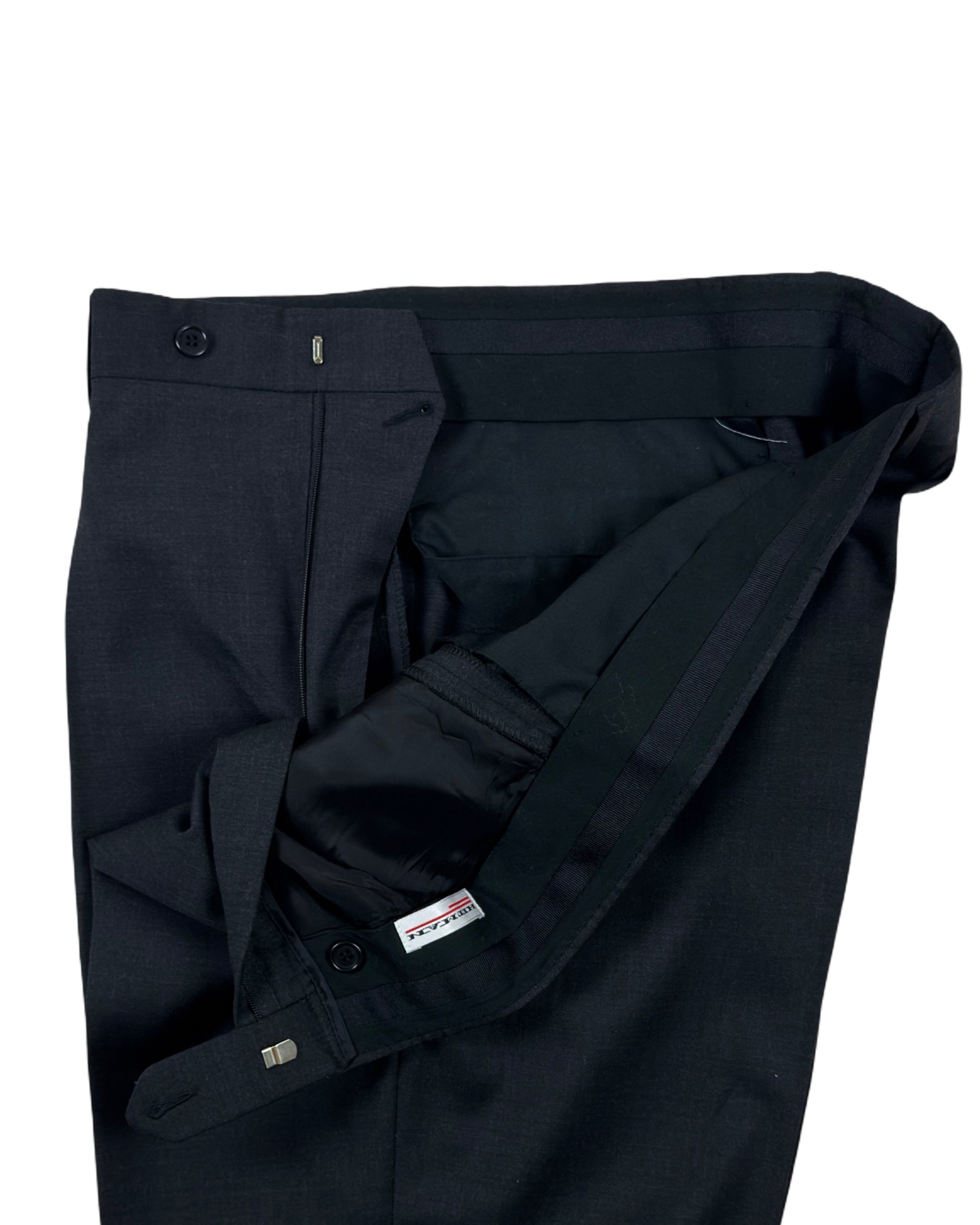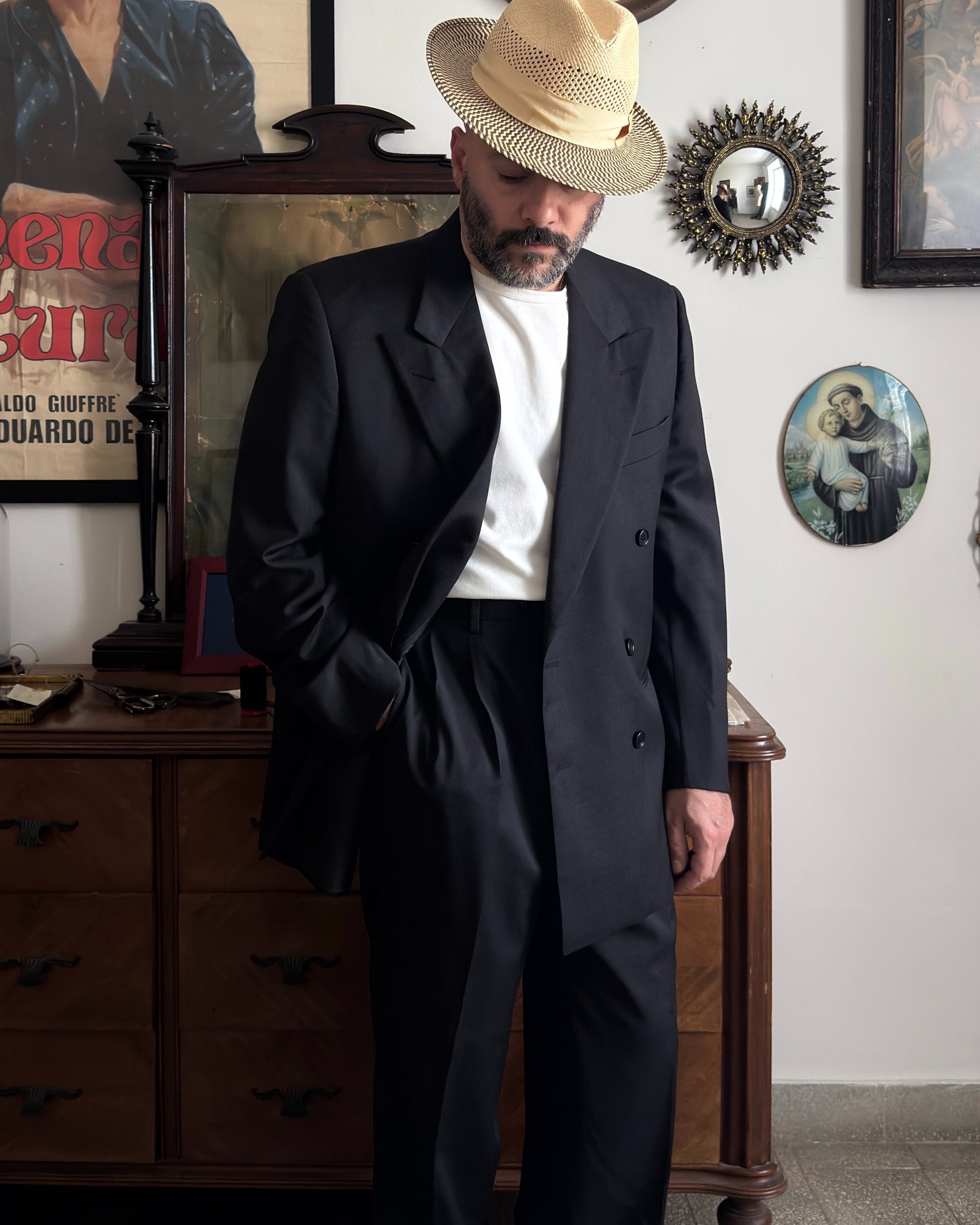 Elegante vestito vintage in pura lana Cerruti, grammatura 120' .La scelta ideale per chi ricerca qualità sartoriale autentica. La giacca doppio petto presenta spalle strutturate, manica lunga e fodera interna, senza spacco posteriore. Il pantalone a vita regolare sfoggia la classica doppia piega sul davanti e tasche America, con chiusura a zip. Colore grigio scuro raffinato, condizioni eccellenti.